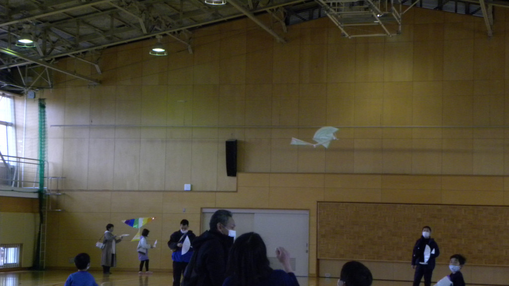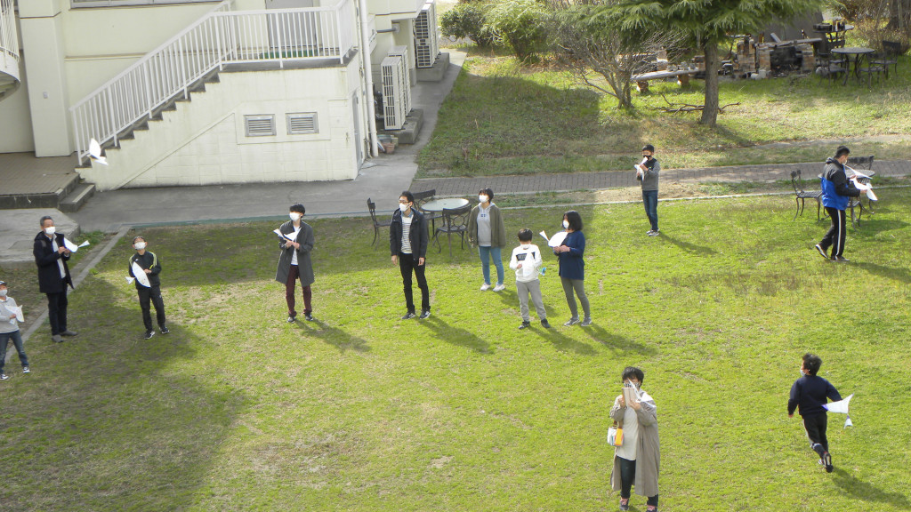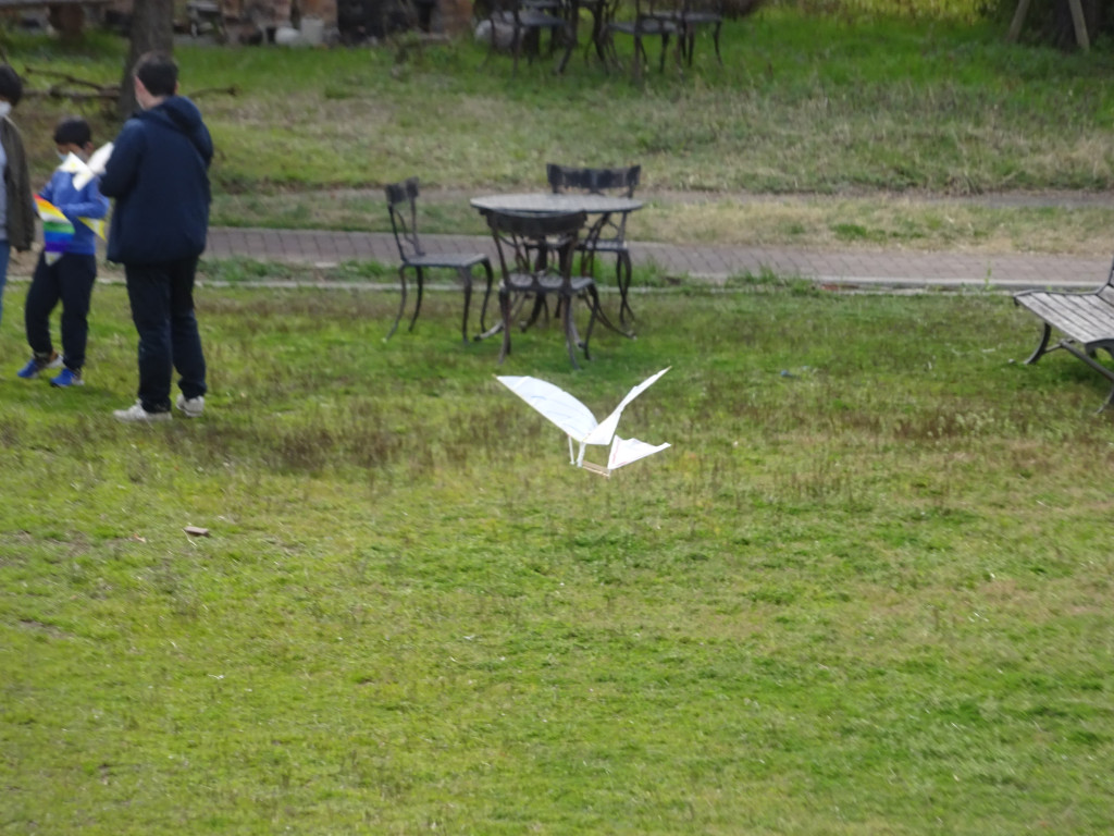 令和3年3月13日(土)に、公開講座「親子で楽しむ工作教室 パタパタ飛行機を飛ばそう」(機械工学科・技術教育支援センター共催)を実施しました.51組の応募者の名から抽選で選ばれた10組の親子が参加しました。前夜に激しい雨が降り、天候が心配されましたが、幸い午後からは雨も上がり、グラウンドと中庭で飛ばすことができました.風がきつくなってきてからは体育館に移動しました。