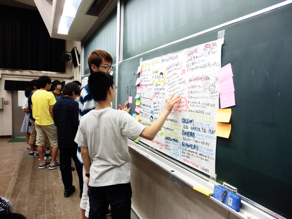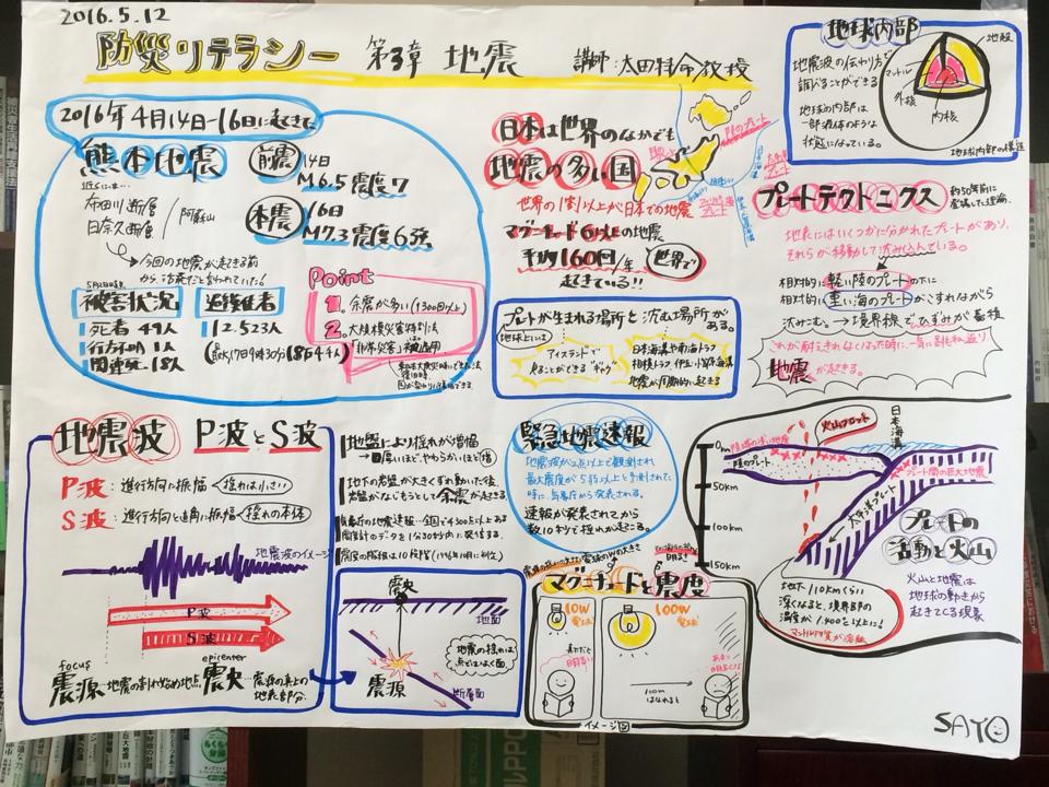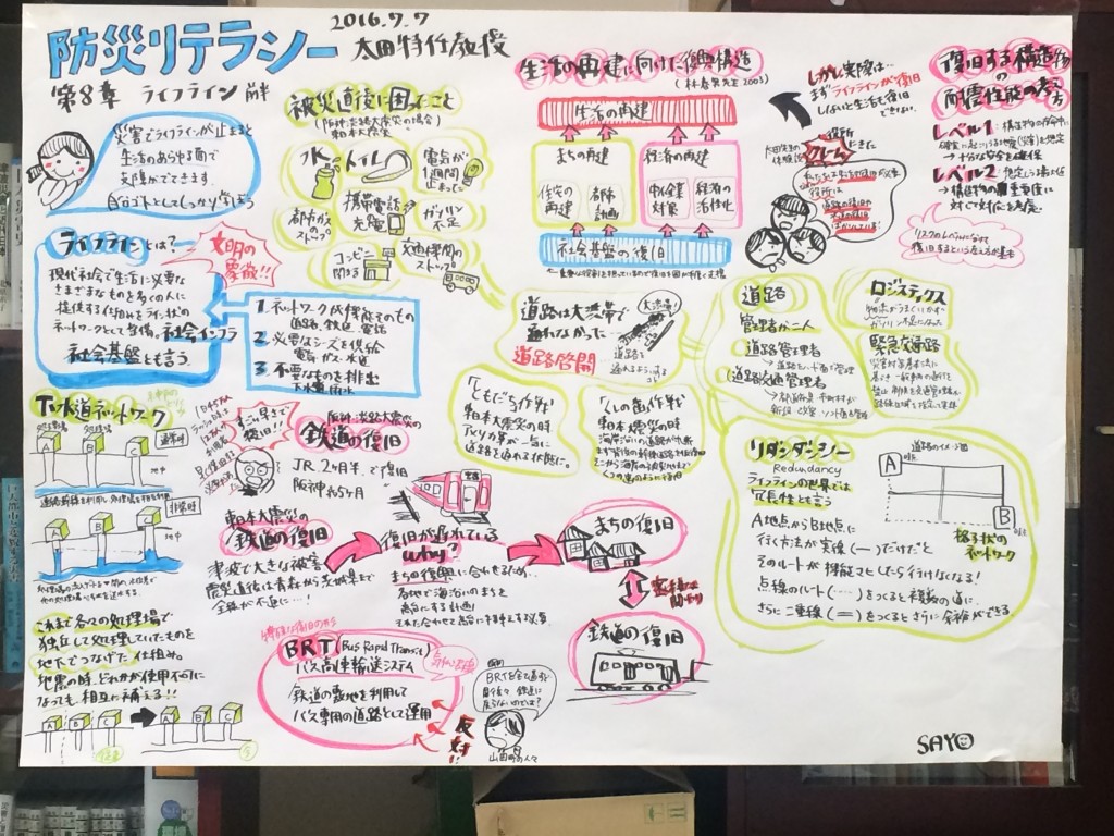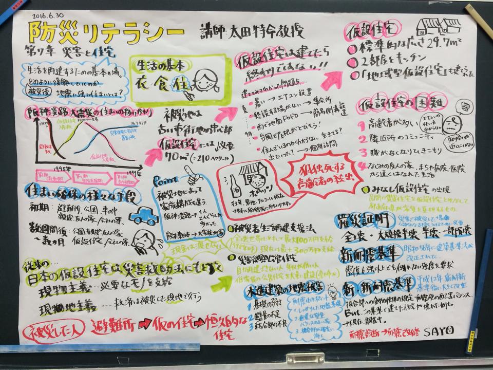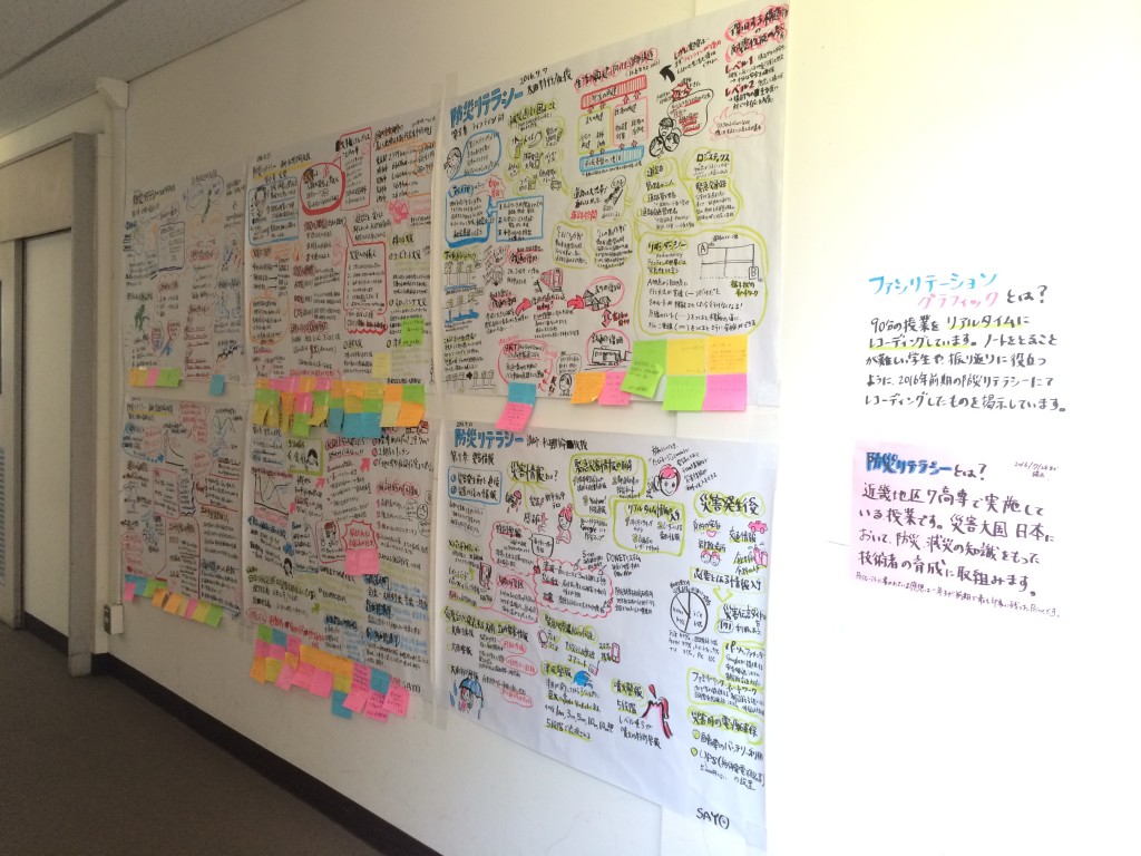 防災リテラシー科目では、平成28年4月1日に施行された「障害者差別解消法」の考えにもとづき、授業中に読み書きに不自由を感じている学生を含むすべての受講生に対し、平成28年度より、出村リサーチアドミニストレーターによる講義のファシリテーショングラフィックを行っています。授業の進行と同時にリアルタイムレコードを行い、授業終了後には、その日の授業を振り返ることができます。また、前期が終わる前には、ファシリテーショングラフィックを用いてこれまでの授業を振り返り、「印象に残った内容」「疑問点」等について付箋紙に書いて貼ることで共有しました。