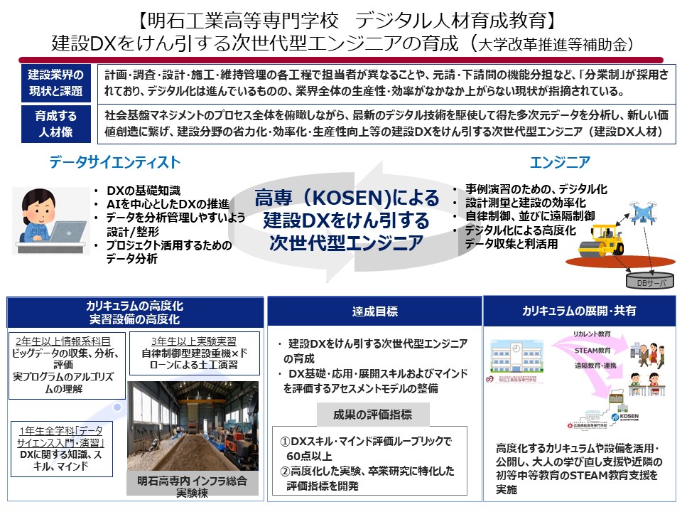 2022年3月、文部科学省の「「デジタルと専門分野の掛け合わせによる産業DXをけん引する高度専門人材育成事業」に、明石高専の都市システム工学科と電気情報工学科が共同申請し、「建設DXをけん引する次世代型エンジニア育成事業」が採択されました。