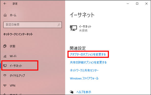 「イーサネット」をクリックし、「アダプターのオプションを変更する」をクリックします。