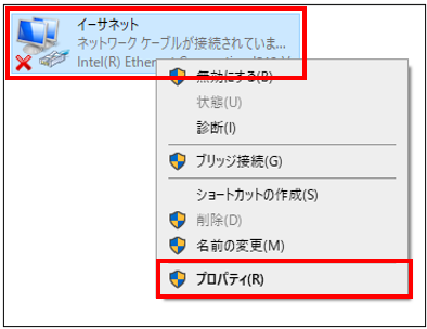 認証の設定をしたいネットワークアダプタを右クリックし、「プロパティ」をクリックします。
