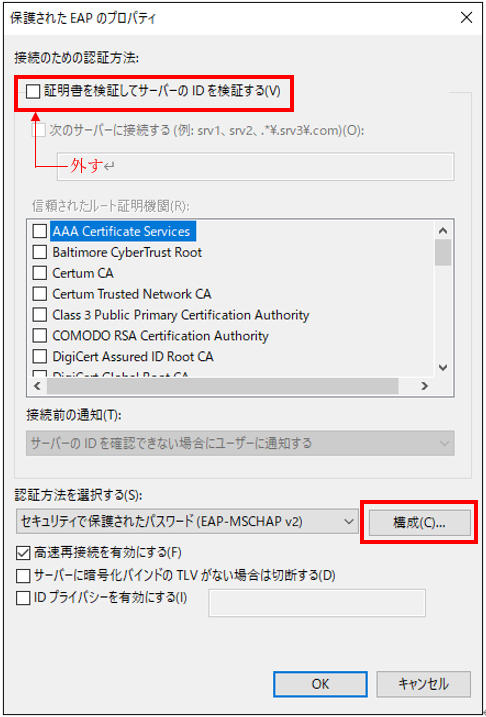 ・証明書を検証してサーバーのIDを検証する:チェックを外す
