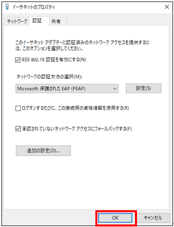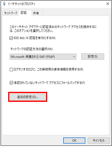 *「認証」タブが表示されていない場合は、前項のWired AutoConfigサービスが起動できていないため、前項に従ってサービスを起動してください。
