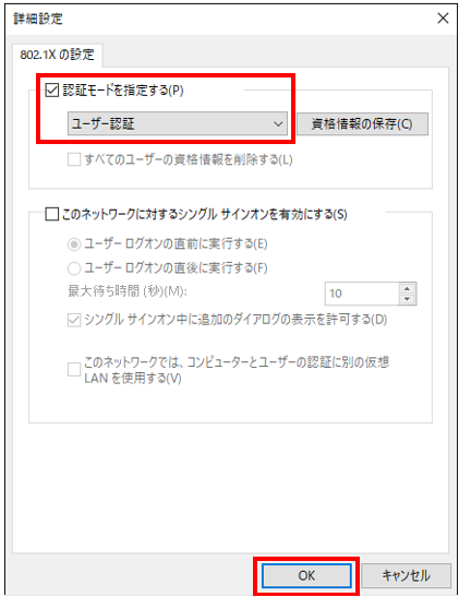 以下の画面が表示されるので、「認証モードを指定する」にチェックを入れ、「ユーザー認証」を選択します。その後「OK」をクリックします。