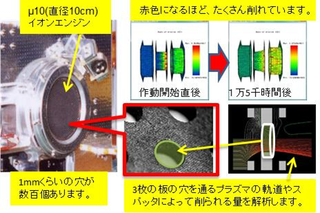 その反力で推進力を得ます。イオンエンジンの寿命は、加速グリッド(カーボン複合材)が、