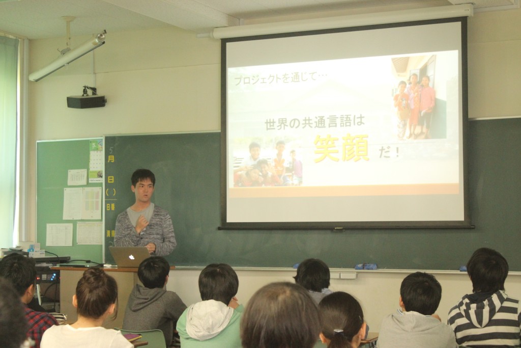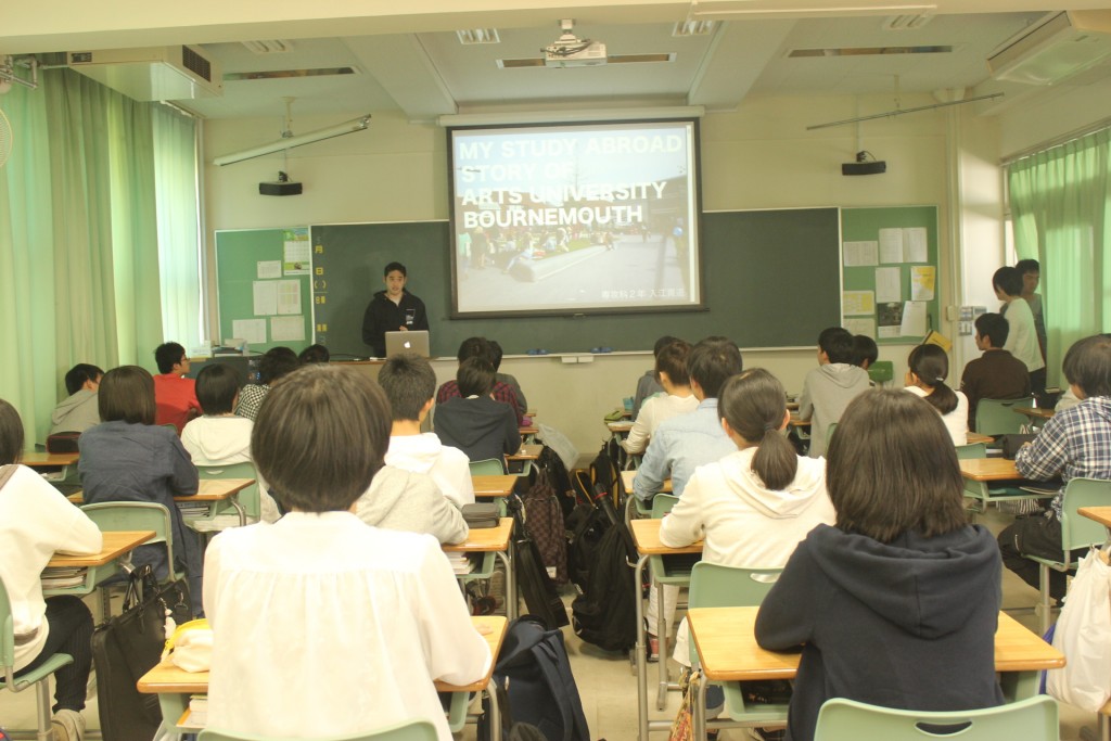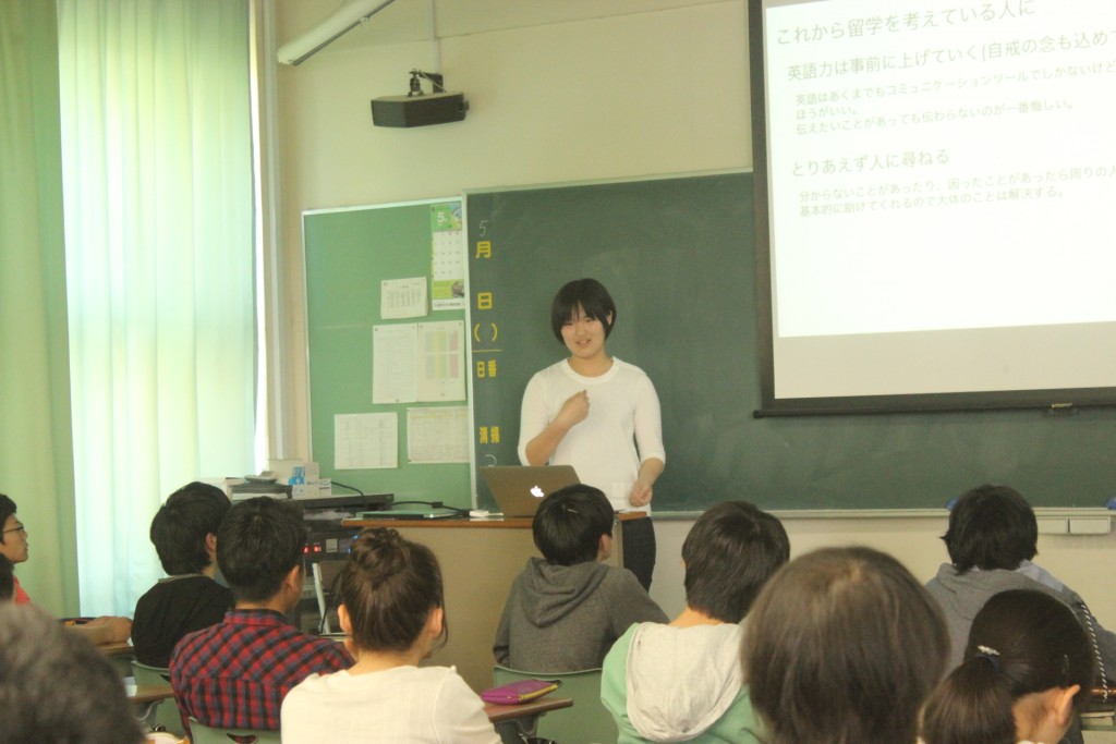 5月18日(水)、1Aのホームルームを利用して、海外留学・研修の様子が報告されました。報告者は、S2の入江貴道君、4Aの市原弾君、浦野萌子さん、真島僚君です。