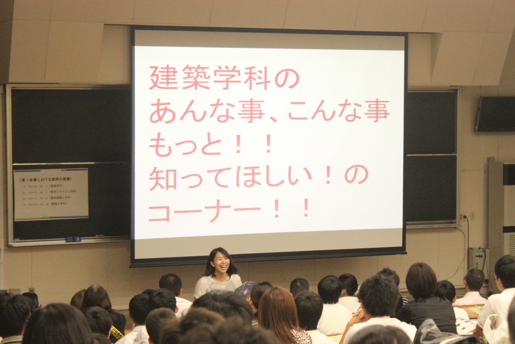 2日間で約461名の中学生の皆さんが明石高専オープンキャンパスに参加してくれました。午前の部は、明石高専の各学科が担当し、学科紹介を行いました。建築学科の学科紹介はすべて学生に説明をしてもらいました。担当した4、5年生の学生の皆さんは、この日のために朝早くから学校に来て準備をしたり、プレゼンの練習をしていましたね。建築学科の魅力を伝えられるように、また、飽きずに聞いてもらえるように、動画やクイズを入れた学科紹介をしてくれました。