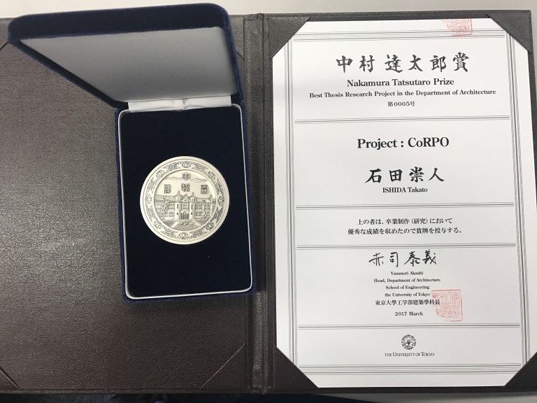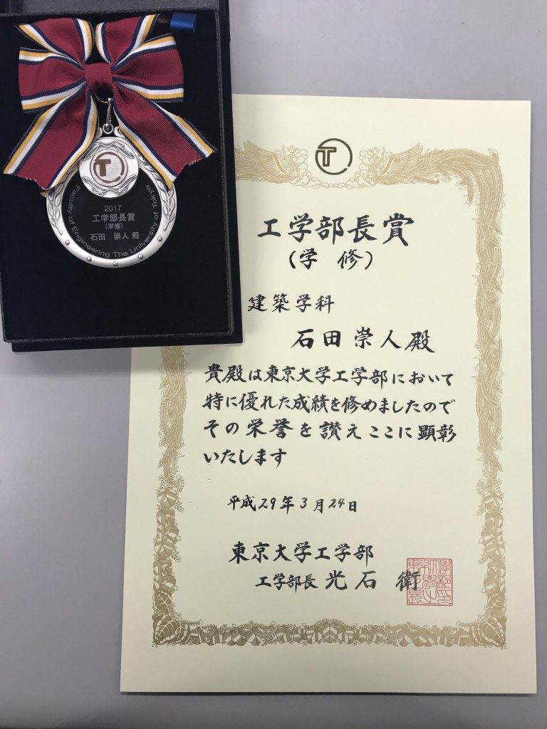 建築学科44期卒業生で平成28年3月に東京大学工学部建築学科を卒業した石田崇人さんが、東京大学工学部長賞と中村達太郎賞を受賞しました。