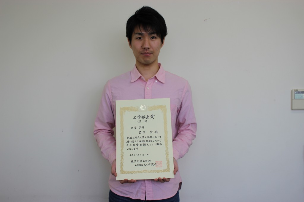 建築学科45期卒業生で平成30年3月に東京大学工学部建築学科を卒業した吉田聖さんが、東京大学工学部長賞を受賞しました。