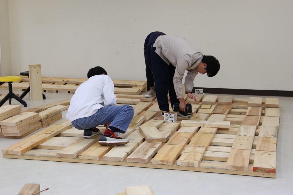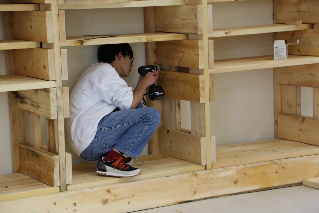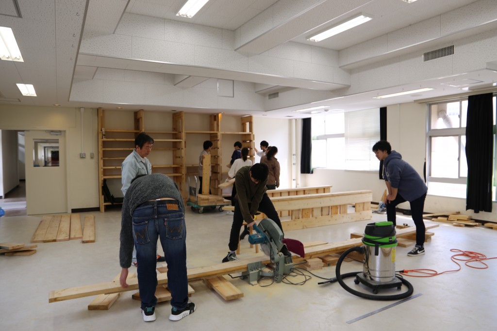 4月1日、2日、東野准教授と学生らが建築棟ものつくり室に木製棚を製作しました。