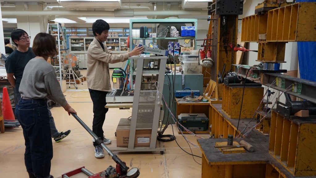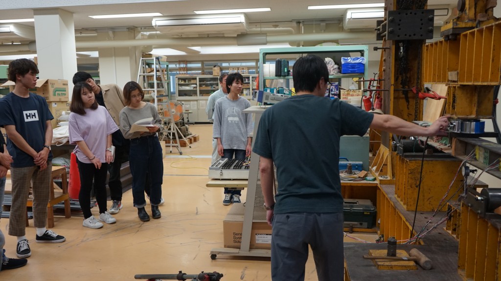 試験に使用するのは、載荷フレーム、油圧ジャッキ、各種測定機器等を組み合わせた特殊な装置ですが、わずかな力を数トンもの力に変える油圧ジャッキや、目に見えない程度の小さな変位を数値化して示すことのできる計測機器などに学生も興味津々のようでした。