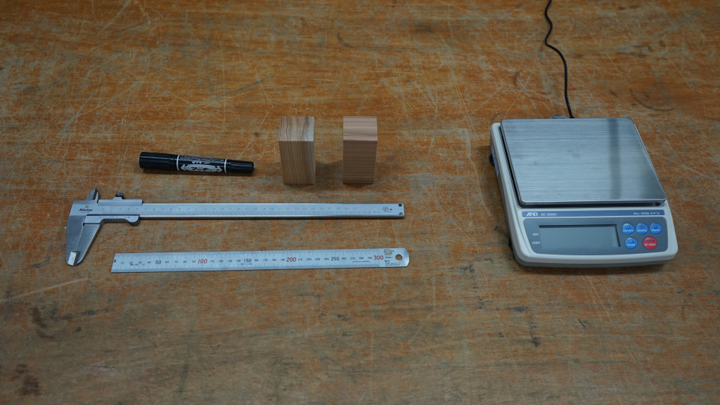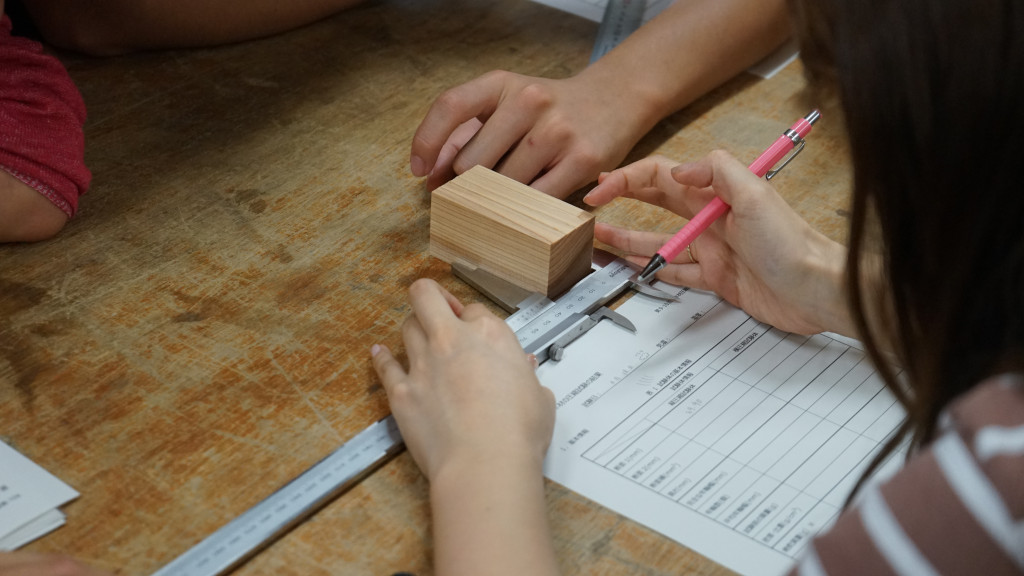 試験に使用するのは、40mm×40mm×80mmのスギですが、試験の前には基本情報として、断面積、高さ、年輪幅などの値を1体ずつノギスで正確に測定します。伝統的な測定器の使用に戸惑う学生もいましたが、その使い方を知ると納得した様子でした。