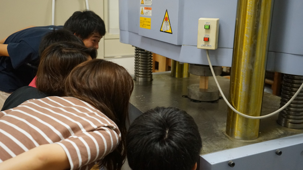 鉄筋の引張試験にも使用した万能試験機を用いて圧縮試験を始めると、学生たちはわずかな変化も見逃すまいと試験機を取り囲み、破壊の前兆である「ピキッ」という音が木材から聞こえると、みんなで競うようにひび割れの位置を探していました。