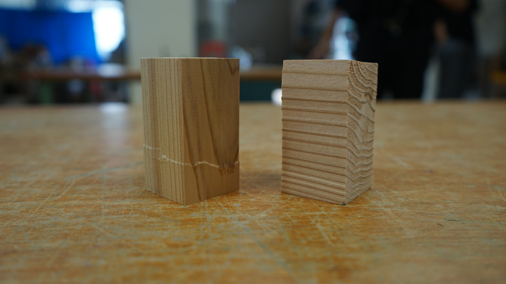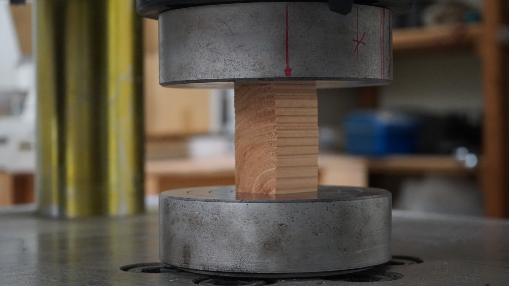 木材は天然生産物であり、力の加わる方向によってその機械的性質が異なるという点が大きな特徴です。今回は繊維と平行な荷重による「縦圧縮」と、繊維に垂直な荷重による「横圧縮」によって、ぞれぞれの方向における圧縮強度を調べました。