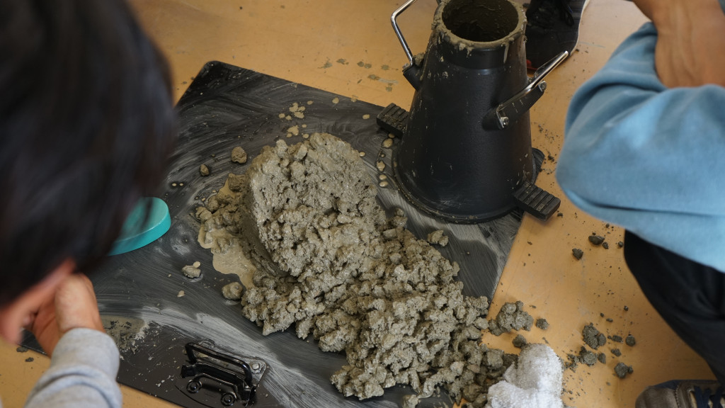 まず、トロ舟の中にセメント、水、骨材(砂、砂利)等を投入してから、シャベルでかき混ぜて試験体となるコンクリートをつくります。続いて、「スランプコーン」と呼ばれる、鋼製の枠にコンクリートを3層に分けて詰めて、それぞれの層を25回ずつ突き棒で突きます。最後に「スランプコーン」を垂直に引き上げて、上面からのコンクリートの下がり具合(スランプ値)を測定尺で測定します。