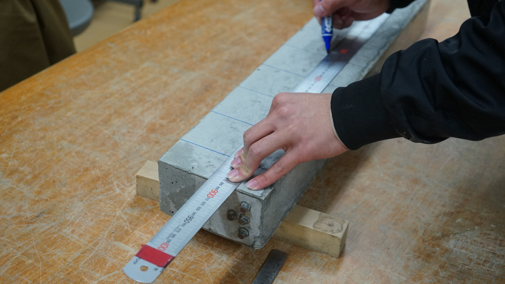 まず、所定の方法で養生した鉄筋コンクリート梁にひび割れ位置を観察する際の目安となるメッシュをマジックで記入します。続いて、梁の中心に力が加わるように万能試験機にセットして、徐々に力を加えていきます。