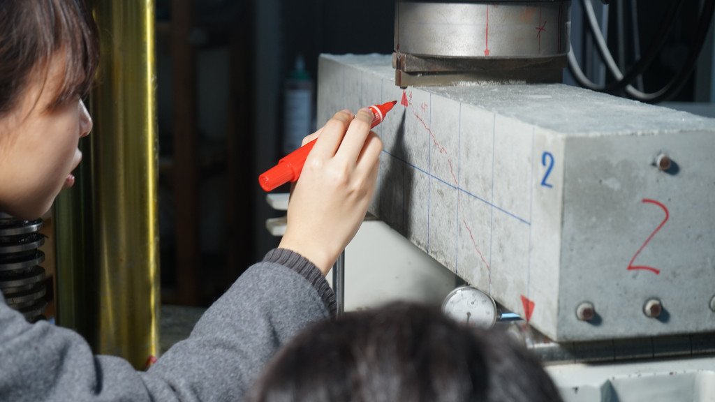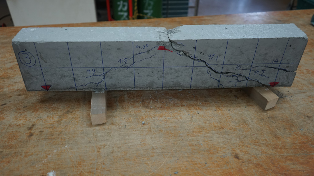 ひび割れをマジックでなぞりながら荷重を読み上げる作業はチームワークが何よりも大切ですが、どの班も協力して上手に取りくむことができました。こうして楽しく工学を学ぶことができるのも実験の醍醐味ですね。