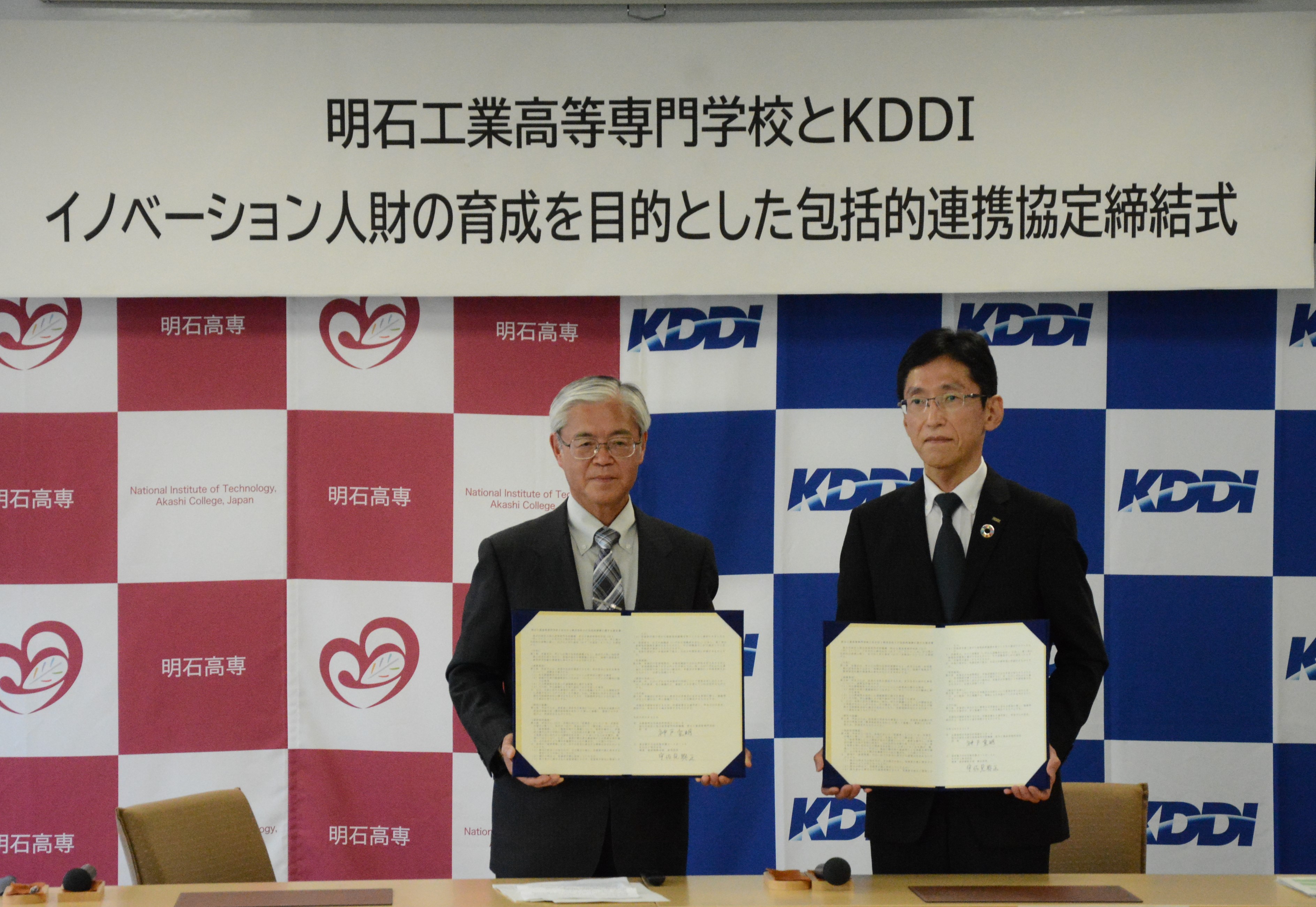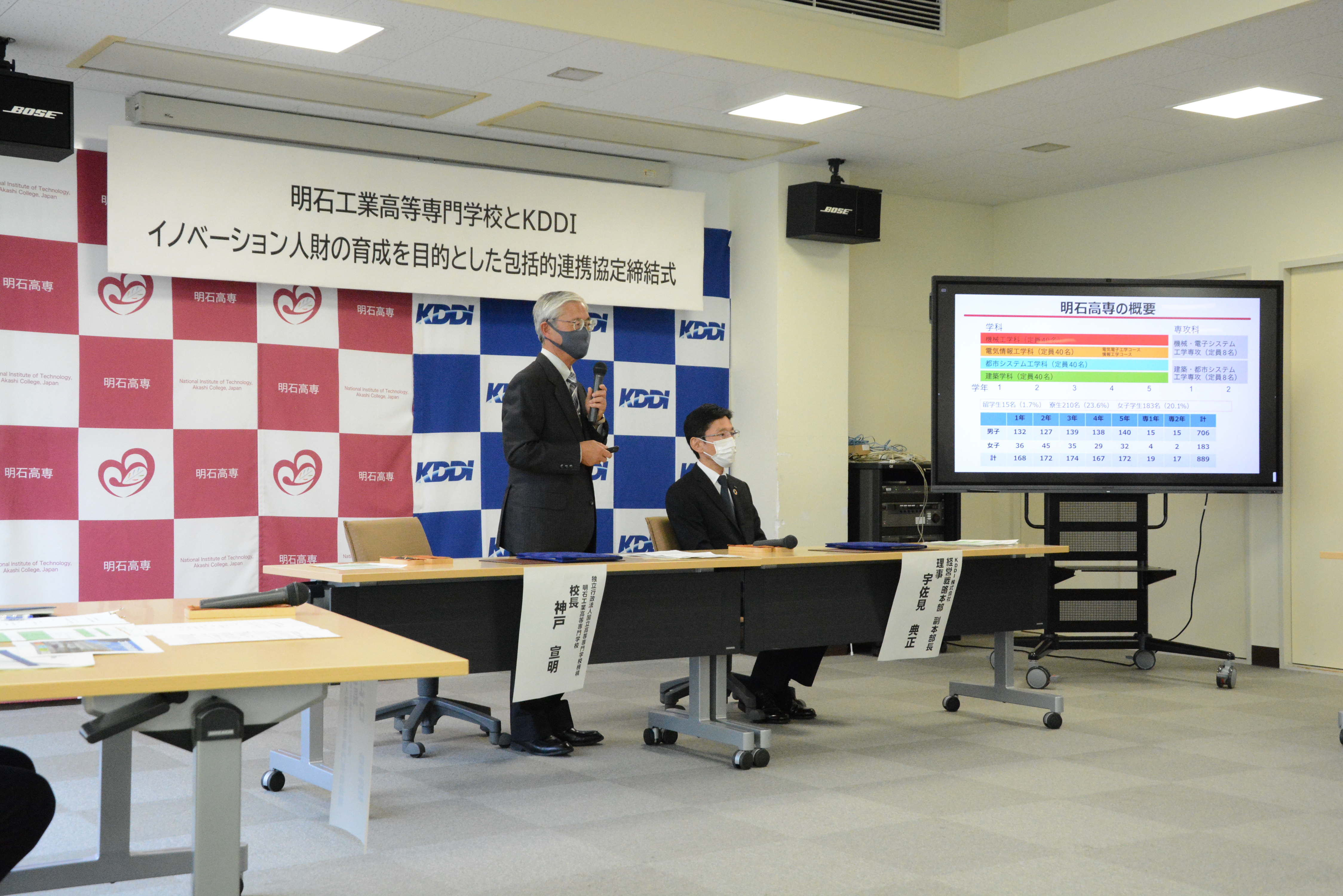 明石高専はKDDI株式会社との間で、教育環境の整備などを通じて、地域産業を担うイノベーション人財を育成する包括的連携協定を2021年6月21日に締結しました。 KDDI株式会社と明石高専は本協定により人的・知的資源を活用し、DXの推進をリードする人財の育成および地域に貢献し続ける人財の育成を目指していきます。