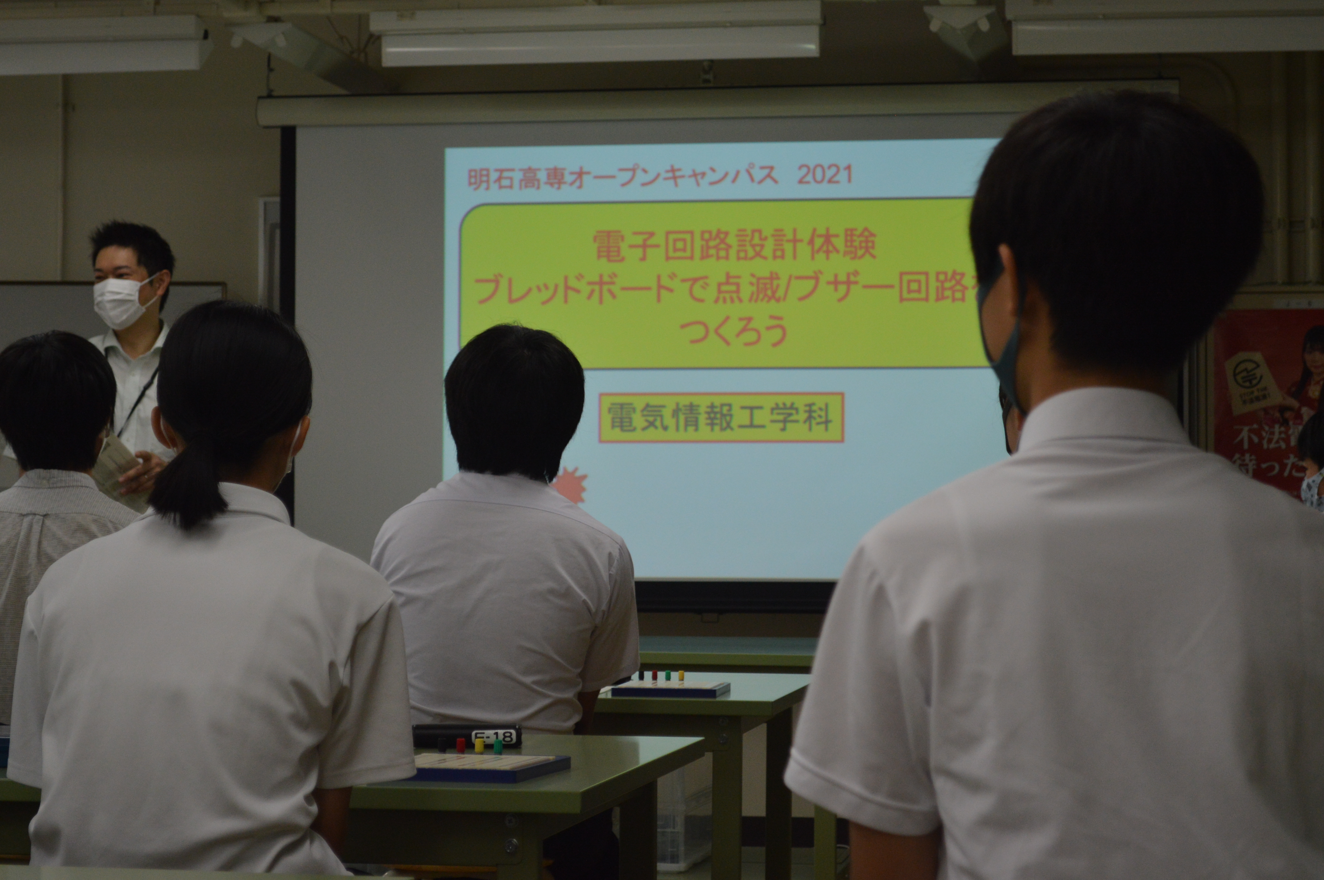今年度の明石高専オープンキャンパスは、7月、8月、10月に渡り計4日間で行っています。今日は7月の部で、4学科がそれぞれ準備した計20以上の体験講座に申し込む形式です。生徒の皆さんが参加されている間、保護者の方には3つの会場に分散いただき、明石高専の特徴の説明や質疑応答の場を設けました。電気情報工学科は、午前に電子回路設計講座、午後はHSPプログラミングを用いたゲーム製作講座(ブロック積み上げゲームとシューティングゲーム製作)を行い、盛況のうちに終わりました。8月、10月の機会もございます。ぜひご参加ください。