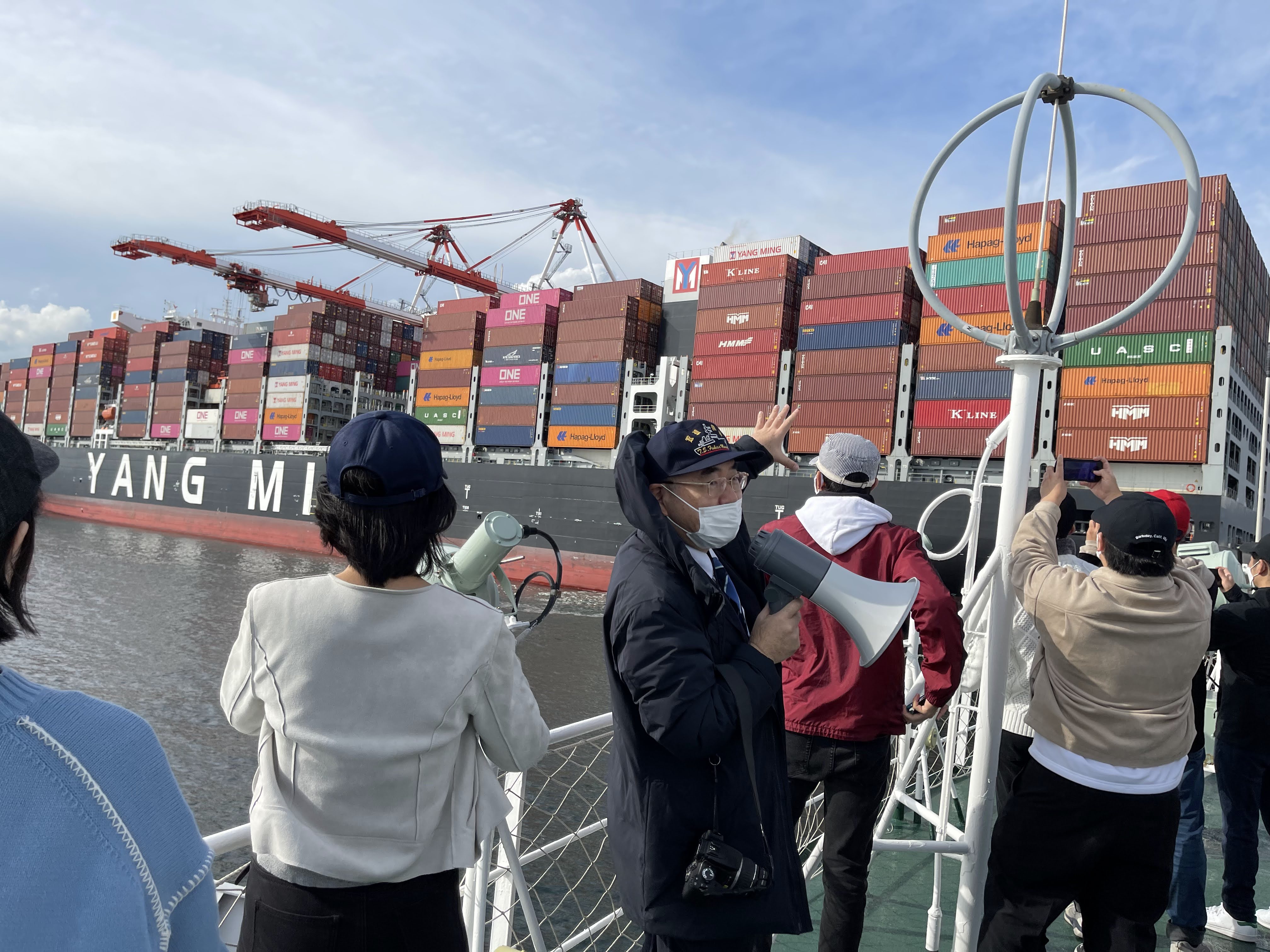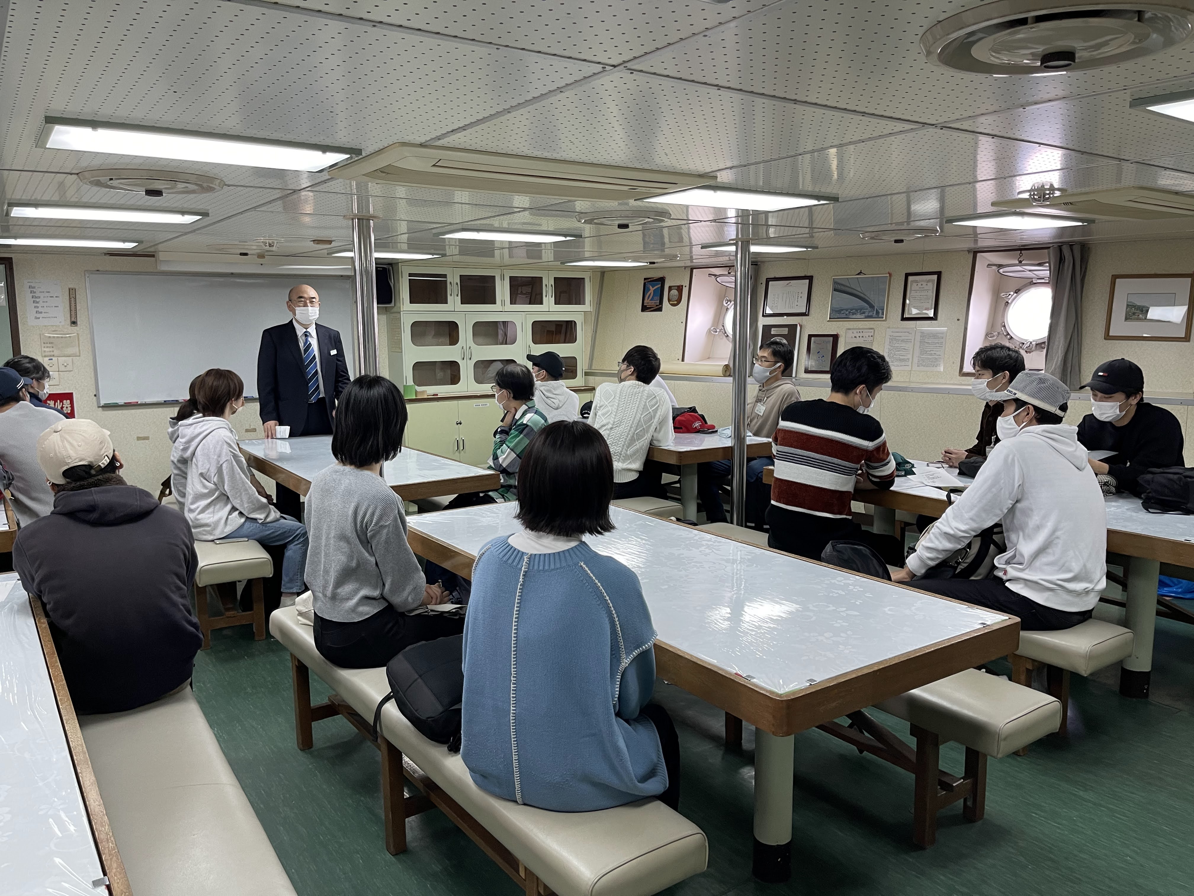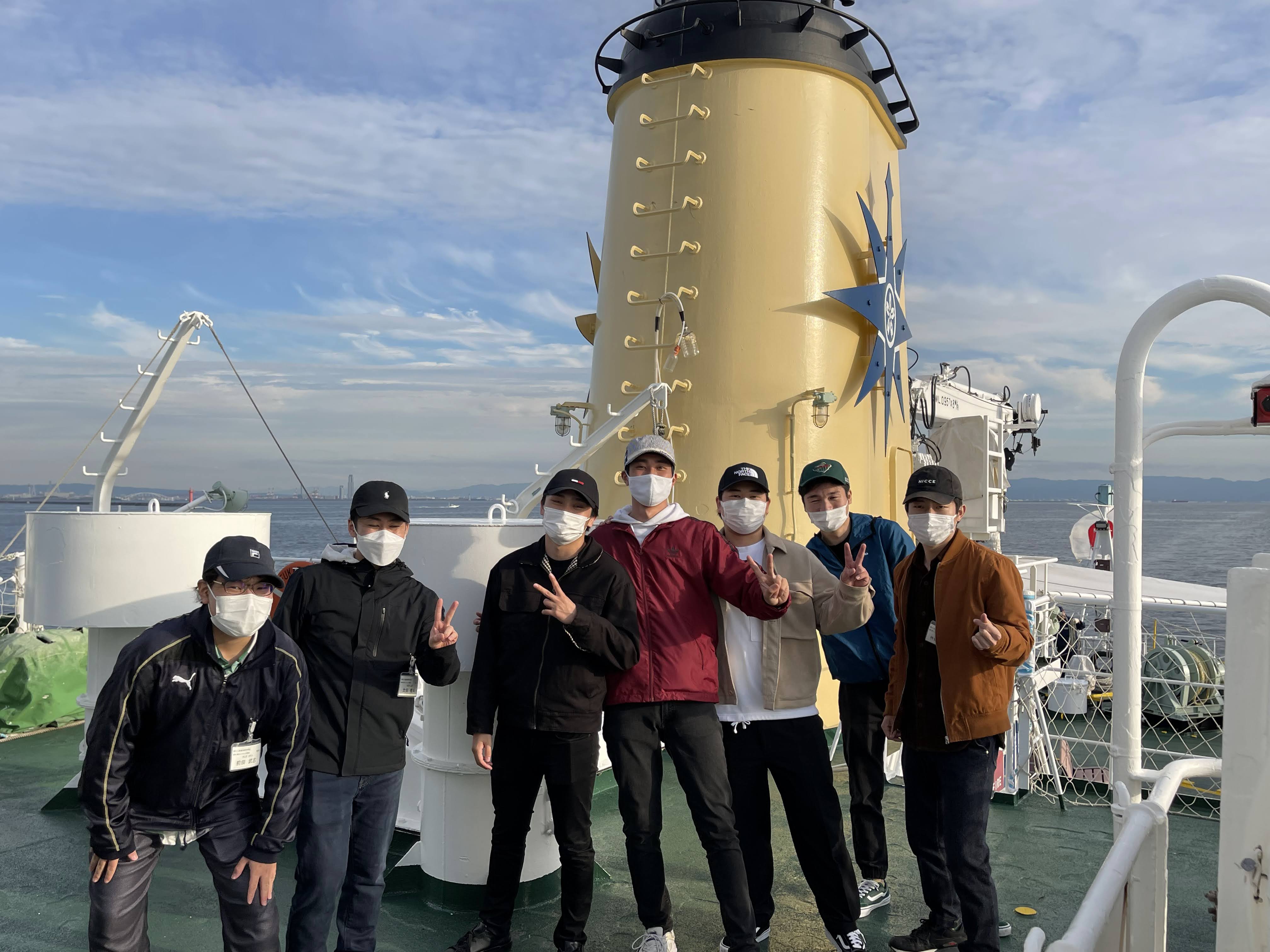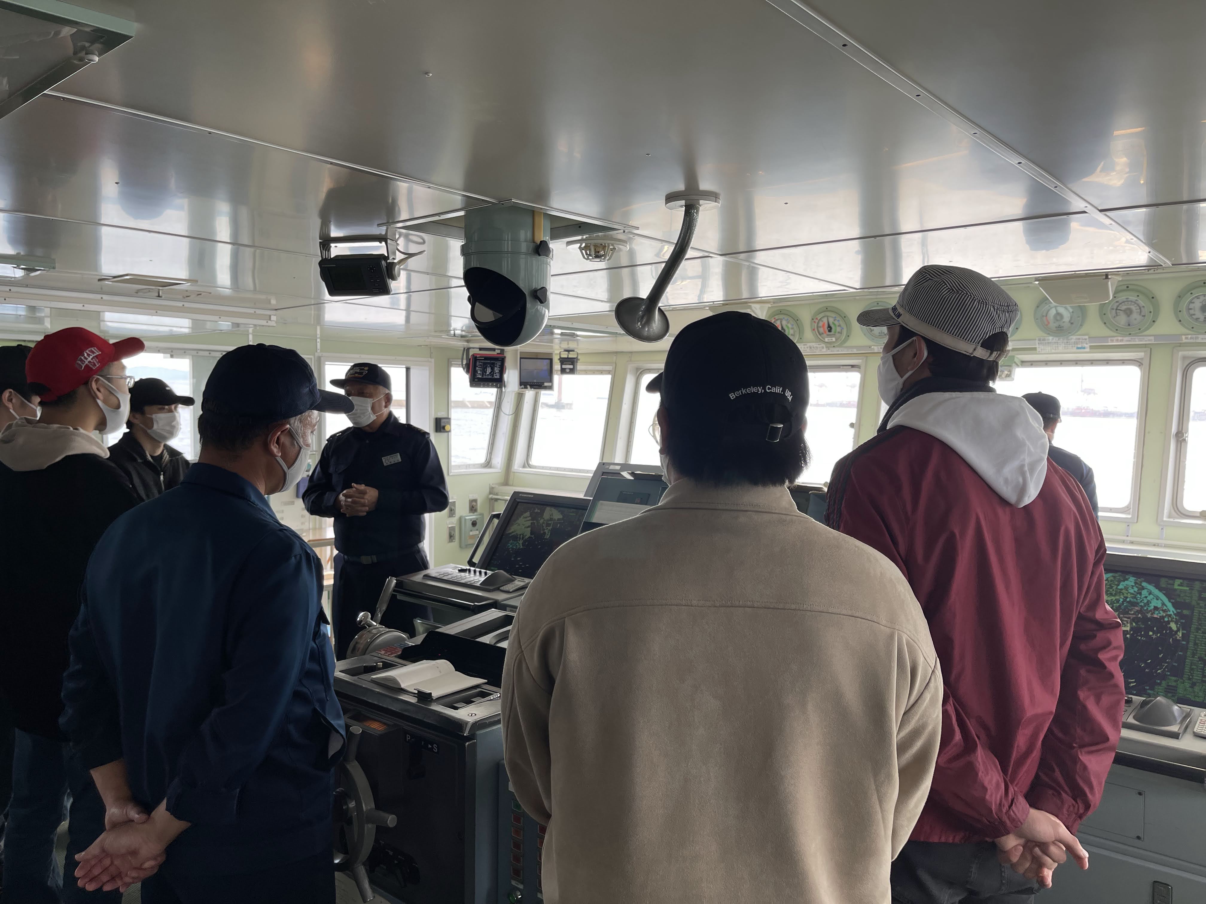令和3年10月27日に専攻科特別講義(専攻科1年ME・AC共通科目)において神戸大学大学院海事科学研究科附属練習船「深江丸」に乗船し航海実習を行いました。同研究科・海事科学部の若林伸和教授、同学部教授の矢野吉治船長より、船舶システムに始まり、造船・航海・通信・港湾等における幅広い最新の科学技術について教授いただきました。