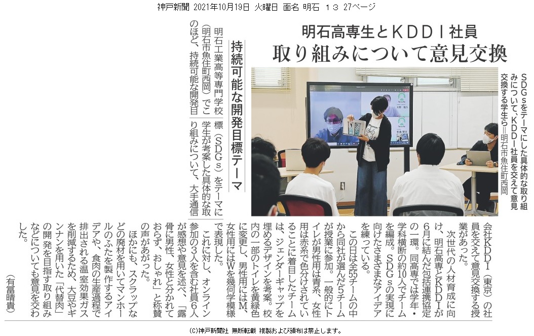 [神戸新聞朝刊 2021年10月19日火曜日l 27面・明石高専生とKDDI社員 取り組みについて意見交換、持続可能な開発目標テーマ]