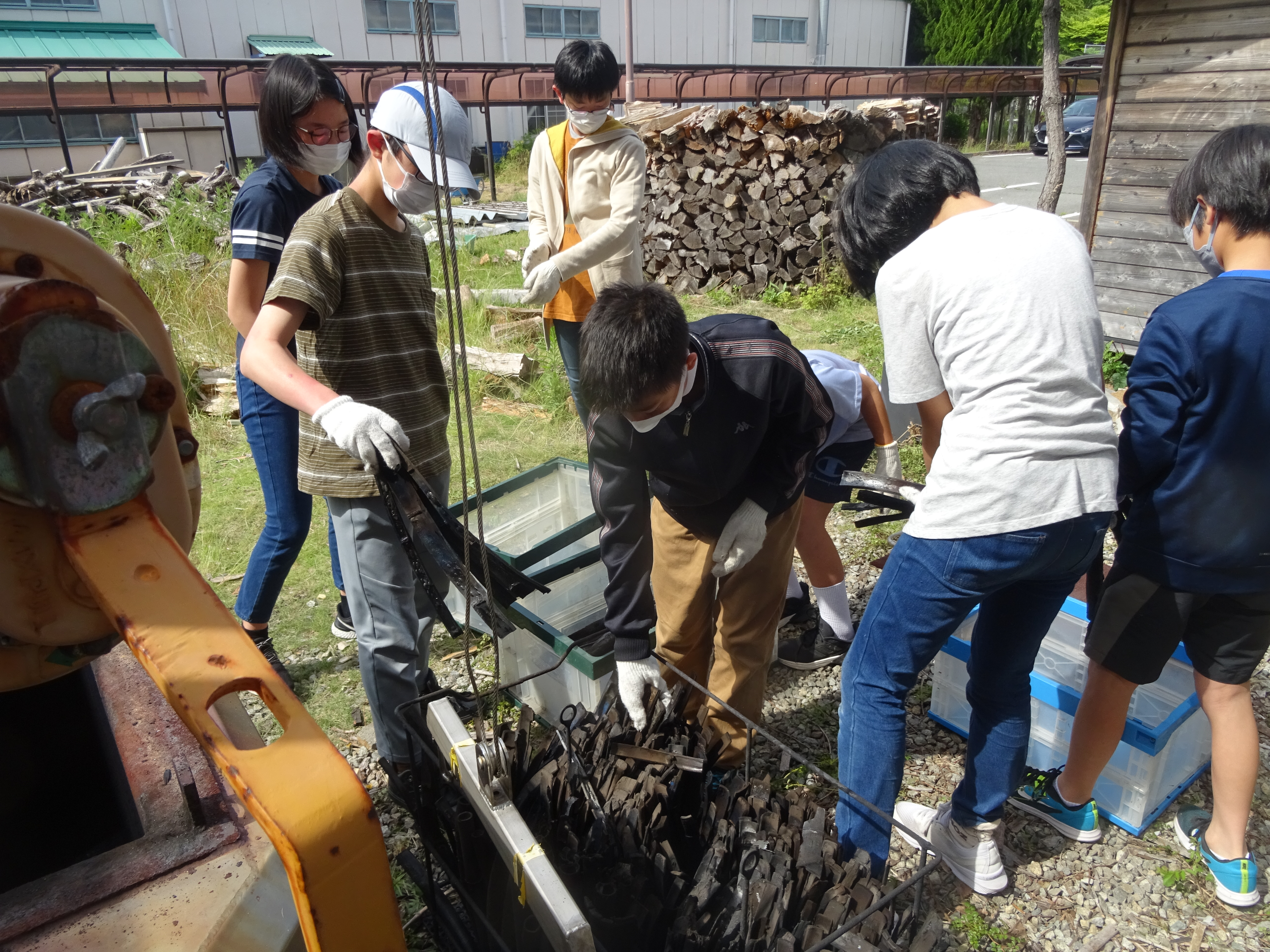 間伐された40cm程度の竹を、4から6等分に割り、節をとって窯(炭化装置)にセットします。竹を空気中で燃やすと、竹の炭素と酸素が結合し二酸化炭素として放出され、燃え尽きます。しかし竹を空気のないところで加熱すると、炭素と酸素が結合せず、水分が抜け炭素分だけが残り炭となります。加熱は2~3時間程度で終了しますが、窯や炭は高温なので炭の取り出しは翌日となります。参加者には竹炭と竹酢液を持って帰っていただきました。参加してくれた中学生のみなさん2日間に渡りご苦労様でした。