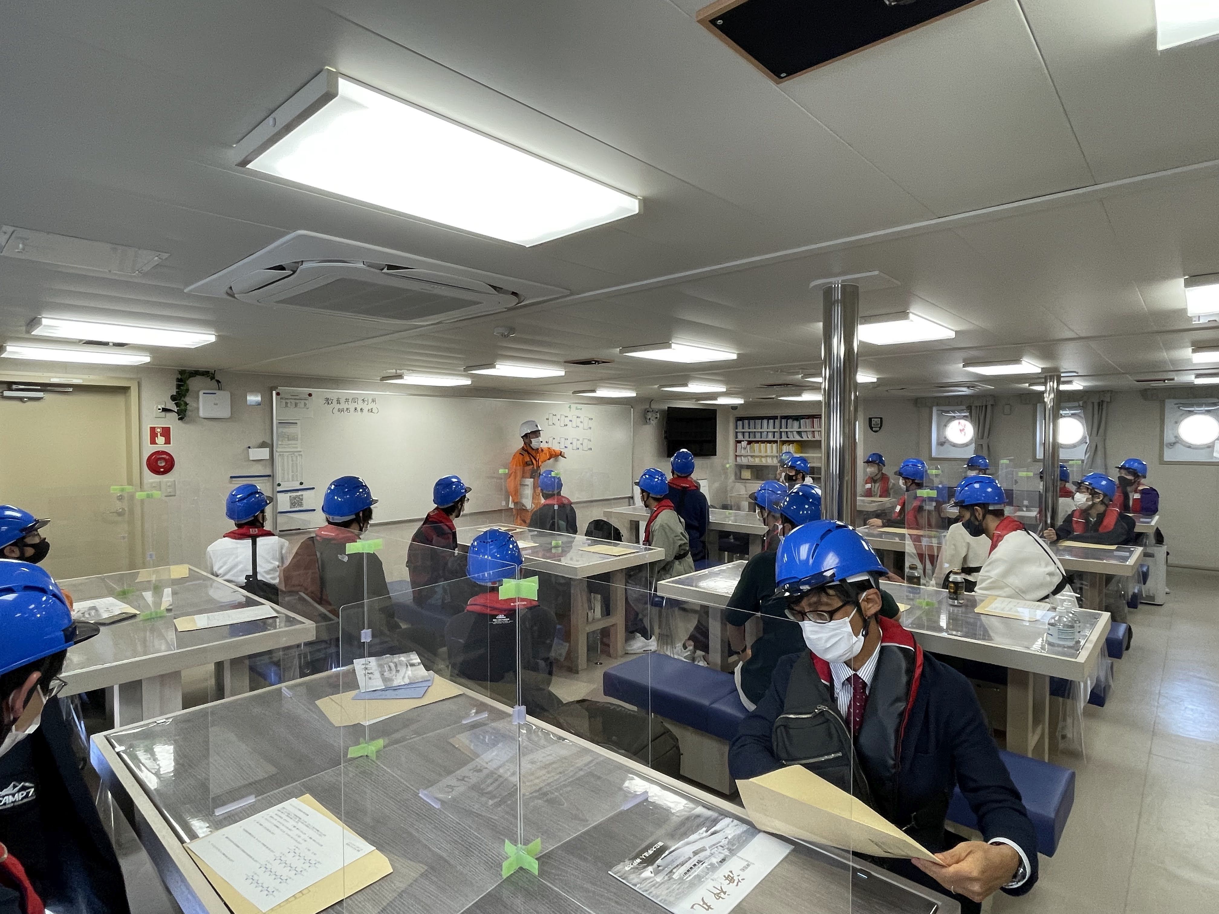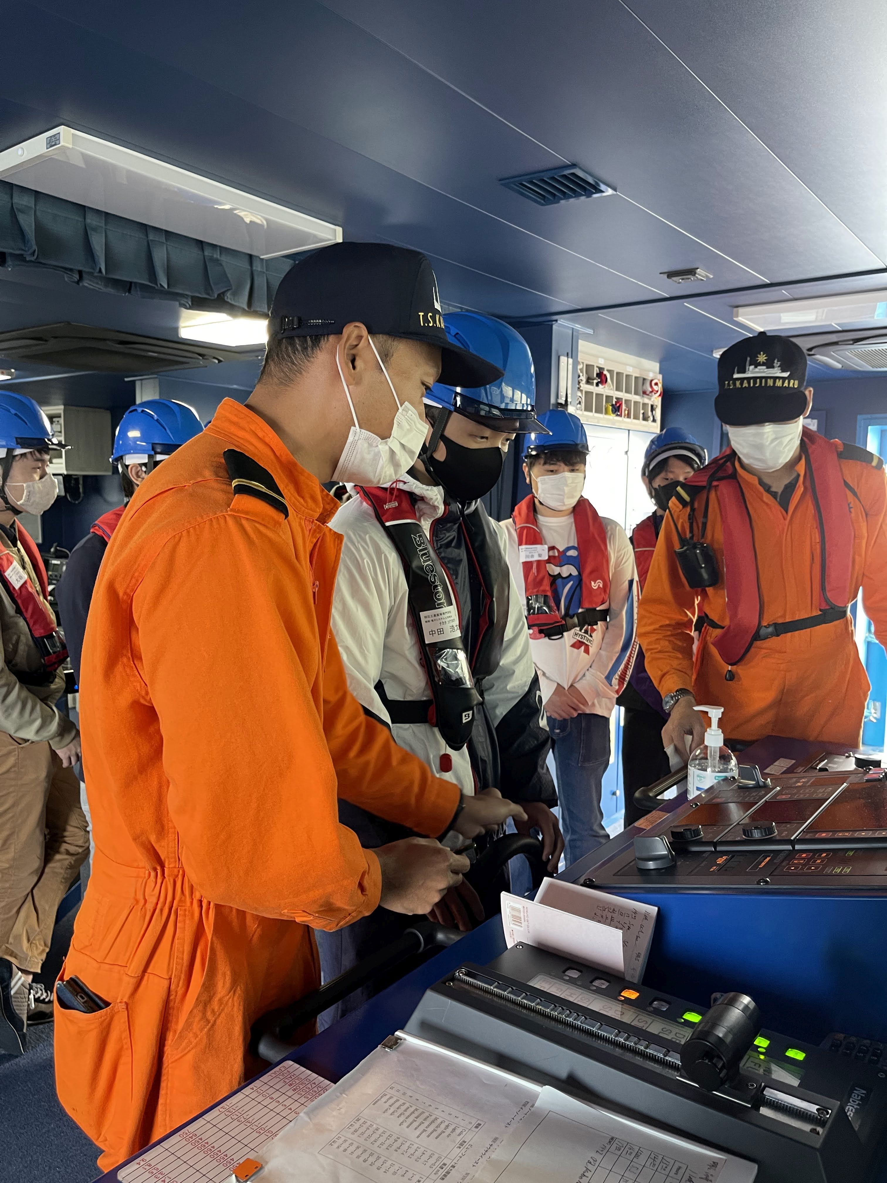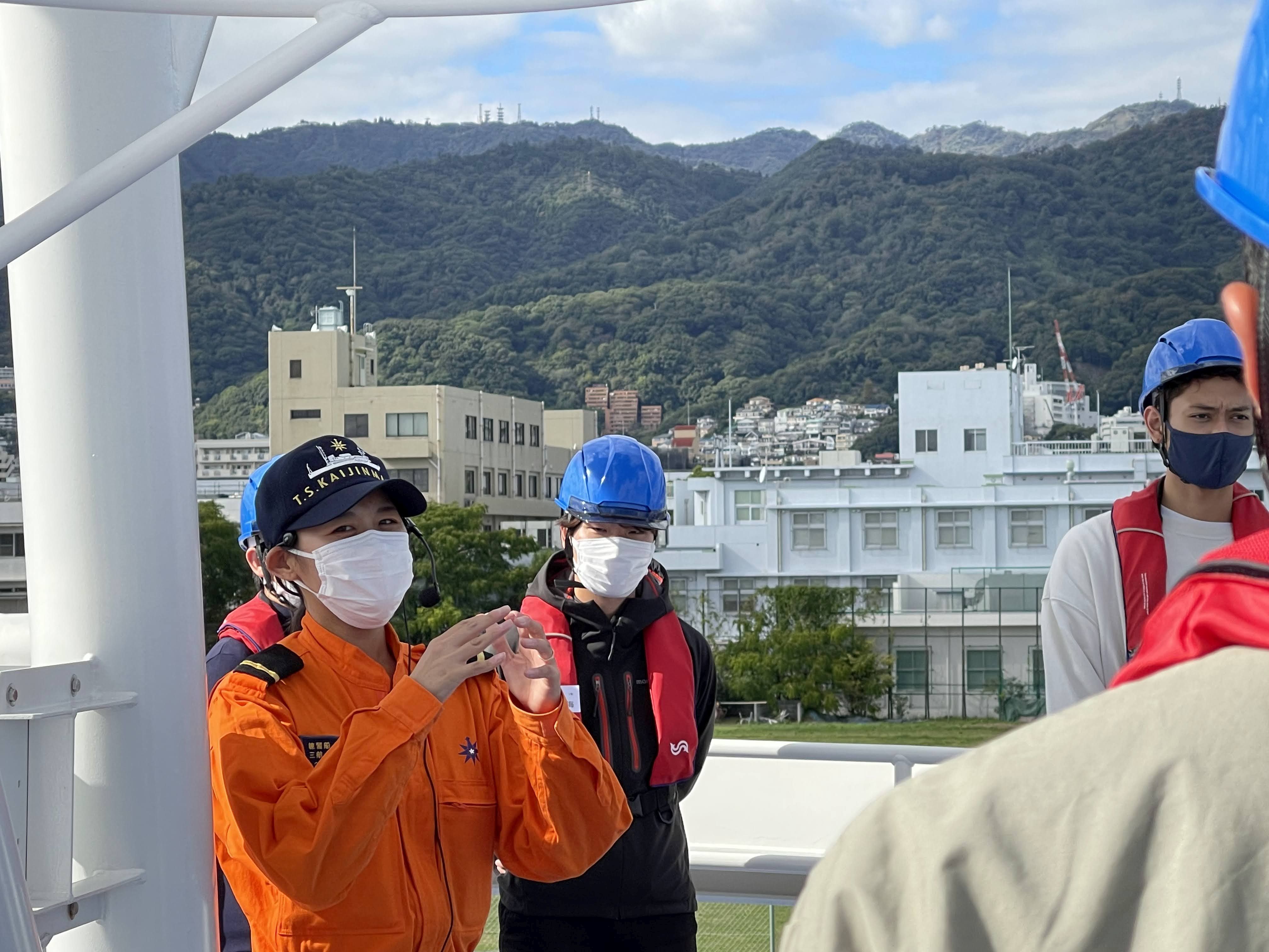 令和4年10月11日に専攻科特別講義(専攻科1年ME・AC共通科目)において神戸大学大学院海事科学研究科附属練習船「海神丸」に乗船し航海実習を行いました。同研究科の藤本昌志教授(船長)、尾崎高司講師(機関長)の案内により、船舶システムに始まり、造船・航海・通信・港湾等における幅広い最新の科学技術について教授いただきました。
