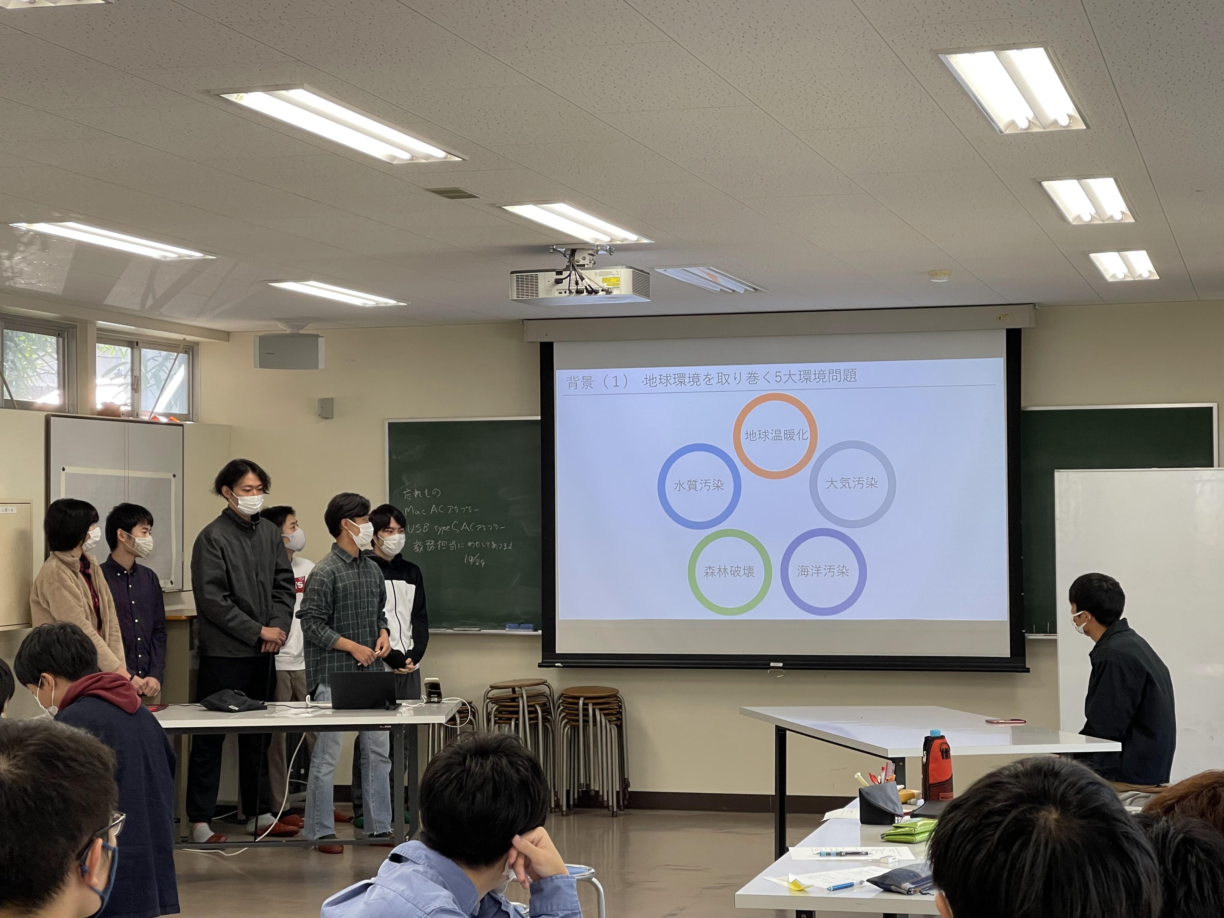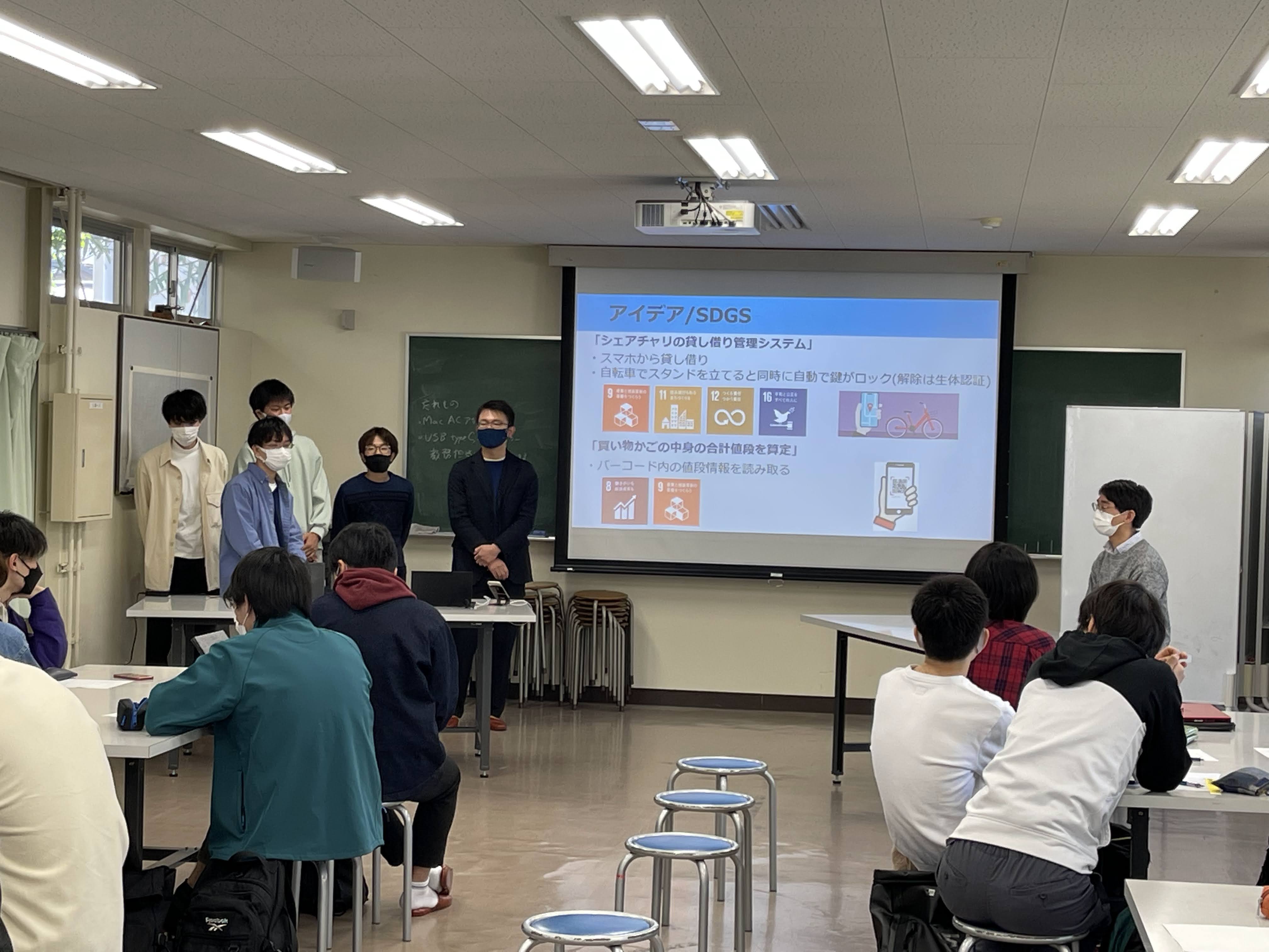 令和4年10月31日(月)に創発ゼミナール(専攻科1年ME・AC共通科目)の中間報告会が行われました。同科目は、機械・電子システム工学専攻および建築・都市システム工学専攻の中の5つの分野(機械工学、電気電子工学、情報工学、土木工学、建築学)の受講生による混成メンバーからなる班でICT活用のPBLを行うことを特徴とします。各自の専攻分野のスキルを、異なる分野のメンバーとの共同作業の中で生かすことを模索・体験することにより認知的、倫理的、社会的能力、教養、知識、経験を含めた汎用的能力の育成を図るものです。