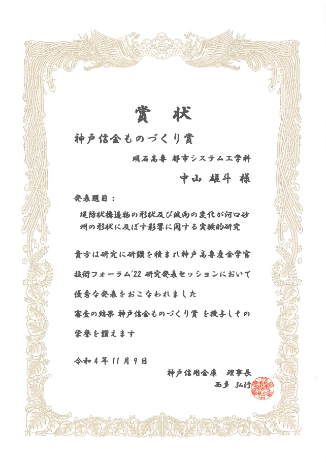 11月9日にオンラインで開催された神戸高専産金学官技術フォーラム‘2022の研究発表セッションにおいて、都市システム工学科5年の中山雄斗さんが神戸信金ものづくり賞(堤防状構造物の形状及び波向の変化が河口砂州の形状に及ぼす影響に関する実験的研究:中山雄斗・三島佳和・神田佳一)を受賞しました。彼らが取り組んでいる卒業研究の成果を発表したもので、研究内容や質疑応答が優秀であると評価されました。