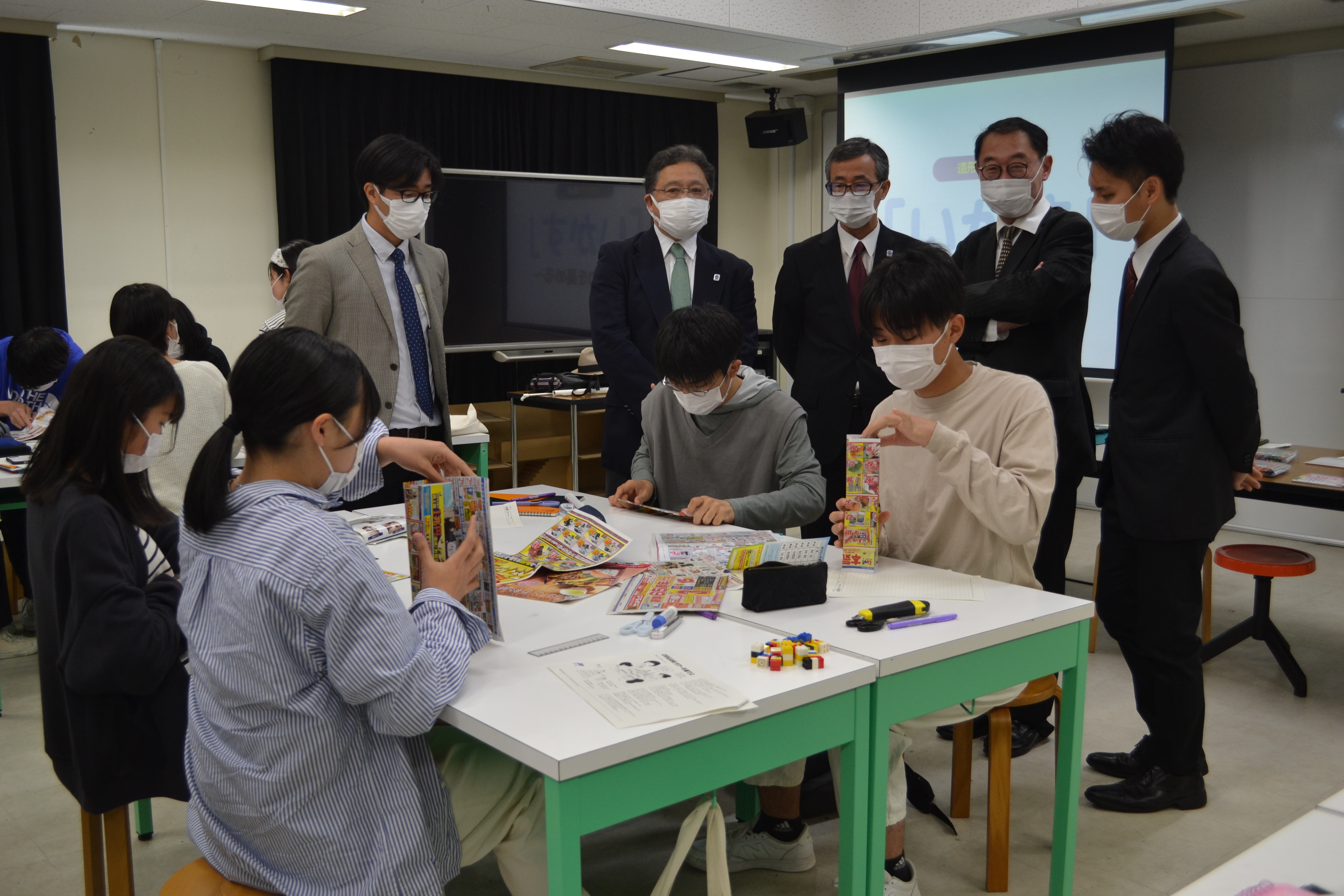 授業の見学では、電気情報工学科2年の電気回路Ⅱにおいて視聴覚教室の授業が自動で録画できるシステムを活用した授業の様子、建築学科1年の造形においてデザイン思考の一環で身近にあるものでものづくりを協働して行う様子、機械工学科3年の機械工学実験ⅠA/工作実習ⅢAにおいて実習工場の工作機械を使用した実験・実習の様子、建築学科4年の英会話Ⅱにおいてはネイティブスピーカーによる授業の様子を見学しました。