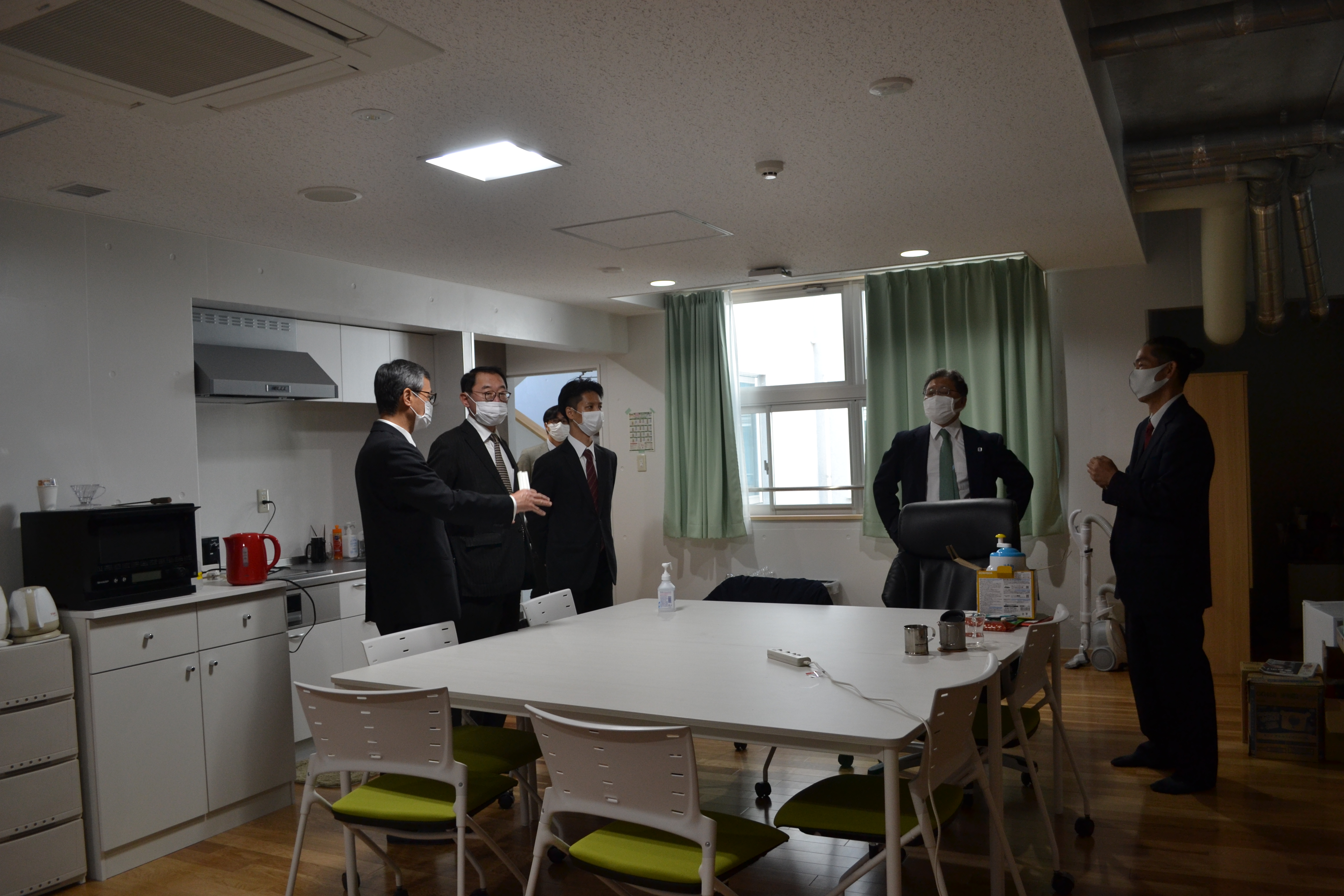 施設の見学では、昨年の10月に開寮した交流スペースを中心としたユニット型の国際寮と低学年の4人部屋のある学生寮の見学を行いました。