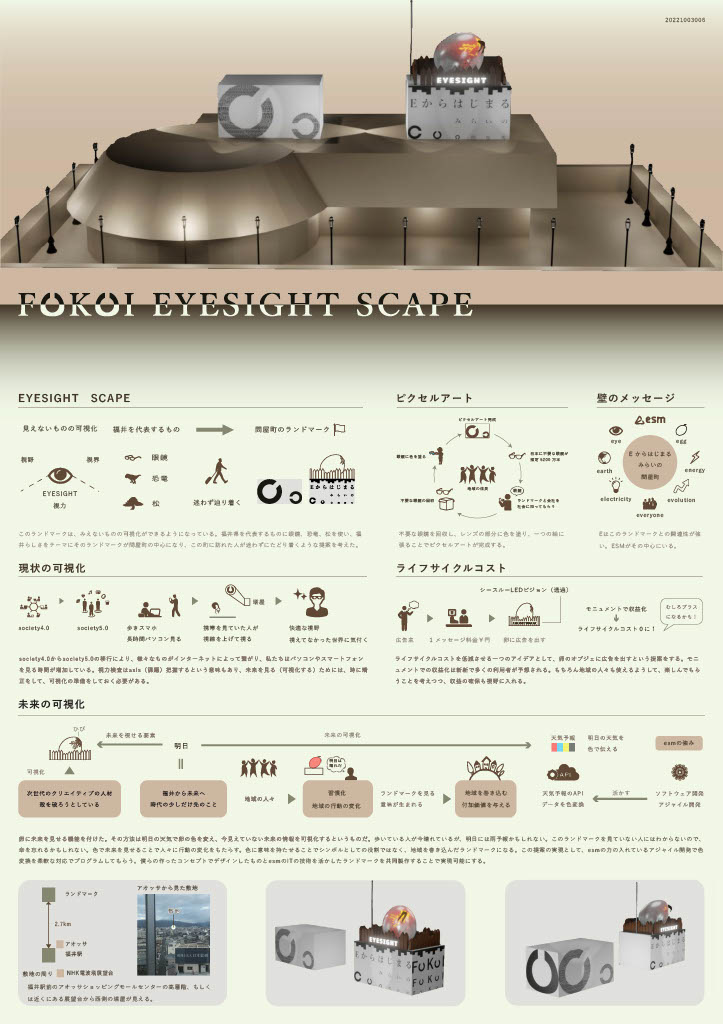 「ランドマークコンペ@福井市問屋町」(主催:株式会社永和システムマネジメント)におきまして、建築学科3年生のグループ(田中大登さん、松田快翔さん、大西治季さん、杉山萌さんの4名)が制作した「FUKUI EYESIGHT SCAPE」が最優秀賞を受賞しました。