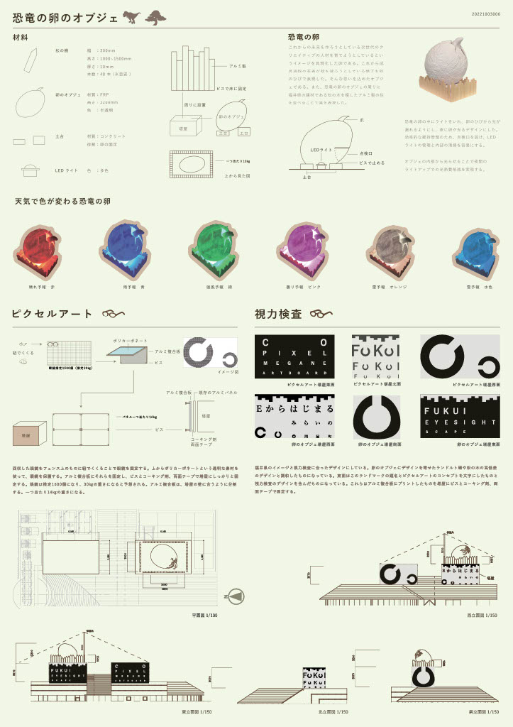 ポスターによる1次審査、プレゼンによる2次審査を経て、大学生・大学院生を含む他の参加者を抑えて最優秀賞を受賞した本作品は、福井市問屋町のランドマークとして、コンペ主催者である株式会社永和システムマネジメント様の本社社屋塔屋に施工されます。