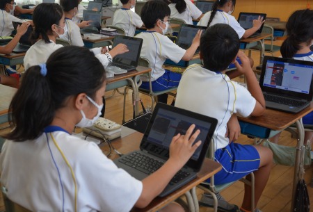 共同授業でプログラミング等を学ぶ米田小児童および保護者の様子