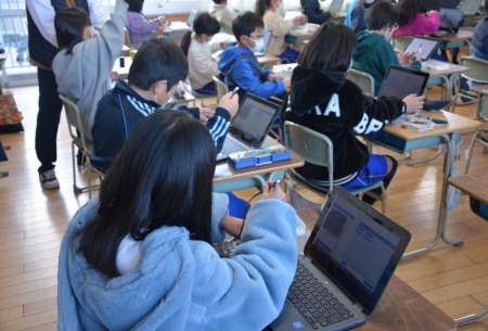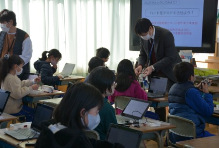 令和4年12月19日(月)に高砂市立米田小学校(以下 米田小)にて4年生全クラスの児童および5年生(保護者同伴)の希望者を対象として、共同授業(micro:bitでアニメーションを作ろう )を開催しました。