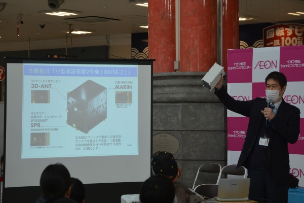 いる超小型人工衛星KOSEN-Xの実物大モデルを紹介し、イプシロンロケットによるKOSEN人工衛星の