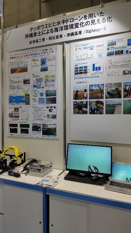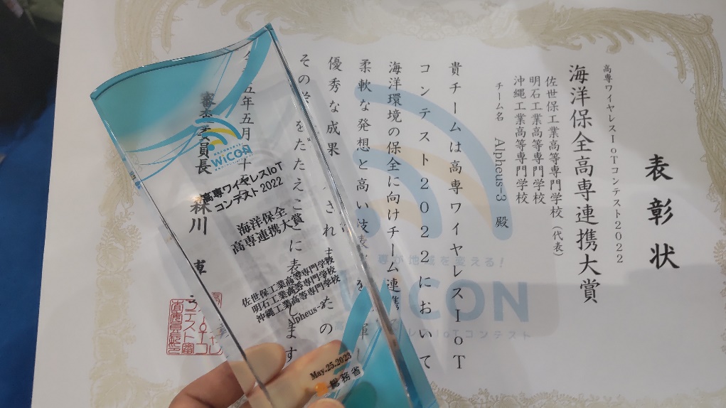 総務省主催の「高専ワイヤレスIoTコンテスト2022(WiCON)」において、佐世保高専(代表校)、沖縄高専、明石高専の合同チームで取組んだテーマが「海洋保全高専連携大賞」を受賞し、令和5年5月25日に東京ビックサイトで開催されたワイヤレレス・テクノロジー・バーク2023(WTP2023)の場において成果報告発表を行いました。テーマは「テッポウエビと水中ドローンを用いた沖縄赤土による海洋環境変化の見える化」で、本校からは建築・都市システム工学専攻の学生2名(渡部研究室)が水中音響観測と環境評価を担当したものです。コロナ禍で困難なこともありましたが、SNS等を駆使し連携した取り組みが行えた成果を得ることができました。