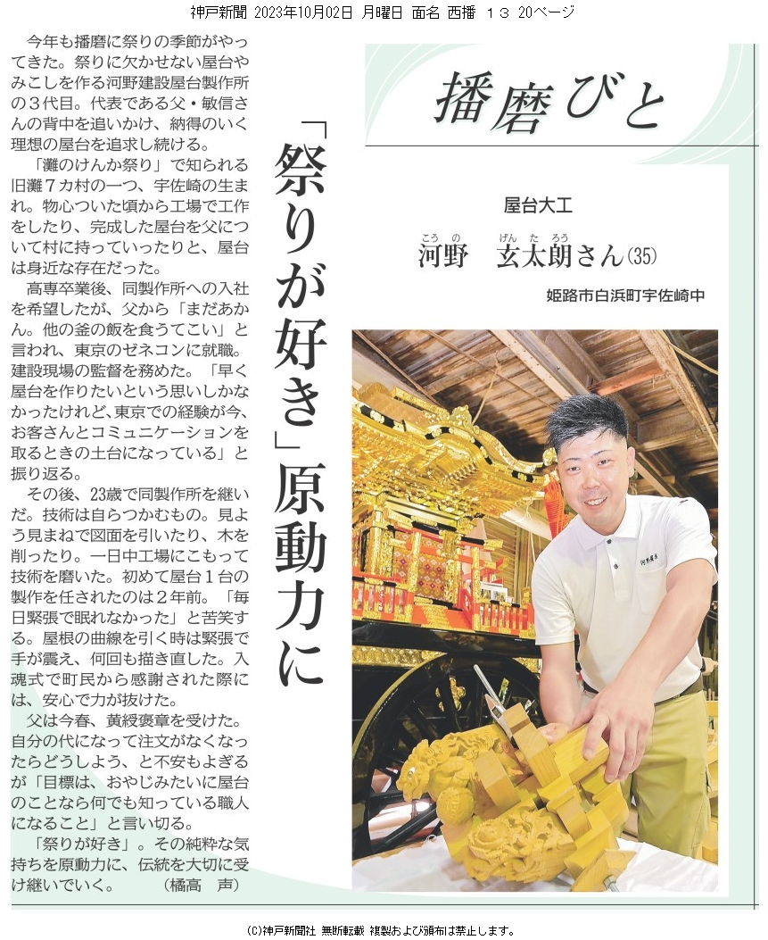 本校建築学科の卒業生(2009年卒)で、屋台大工として活躍する河野玄太朗さんの記事が神戸新聞に掲載されました。