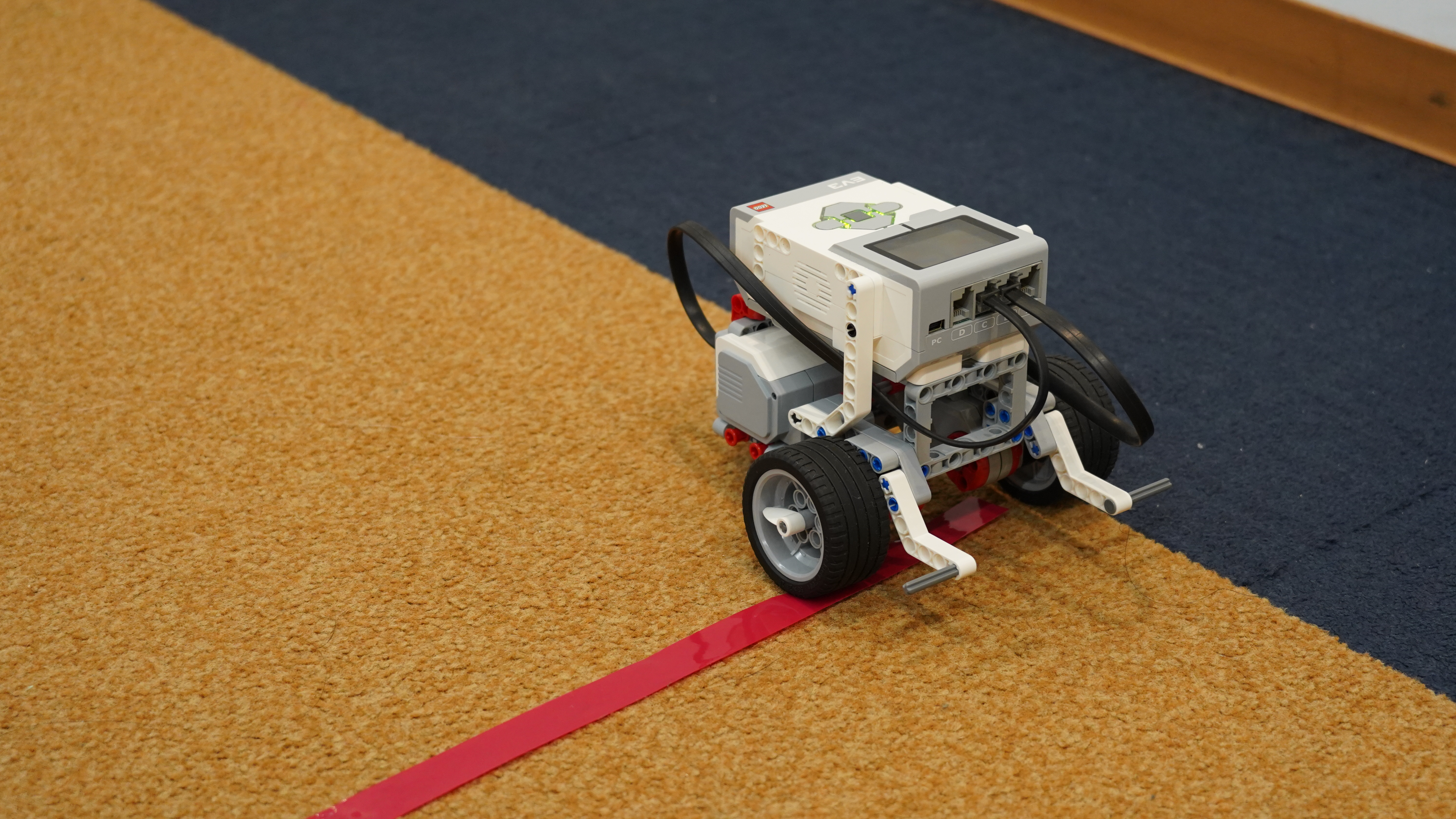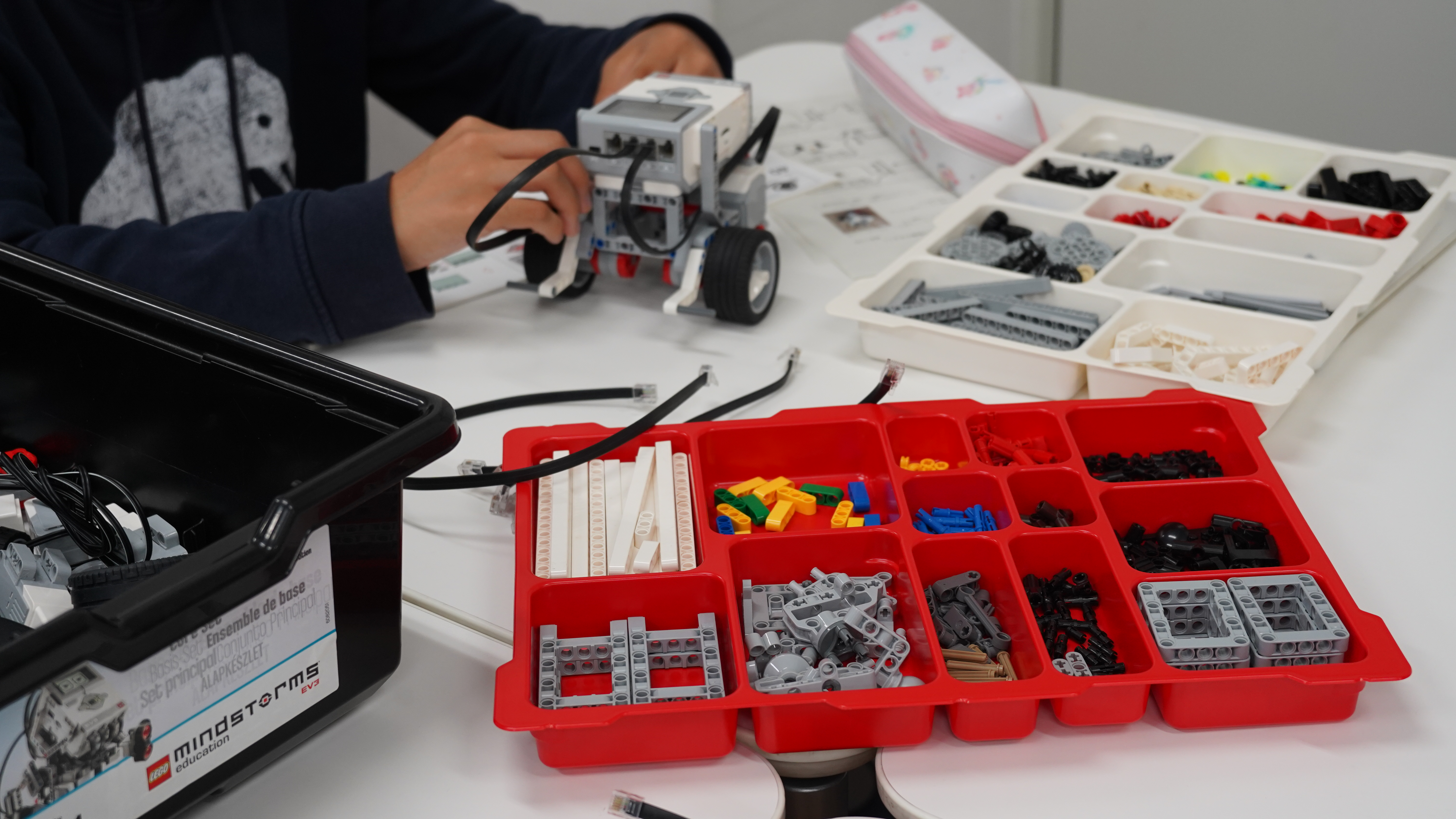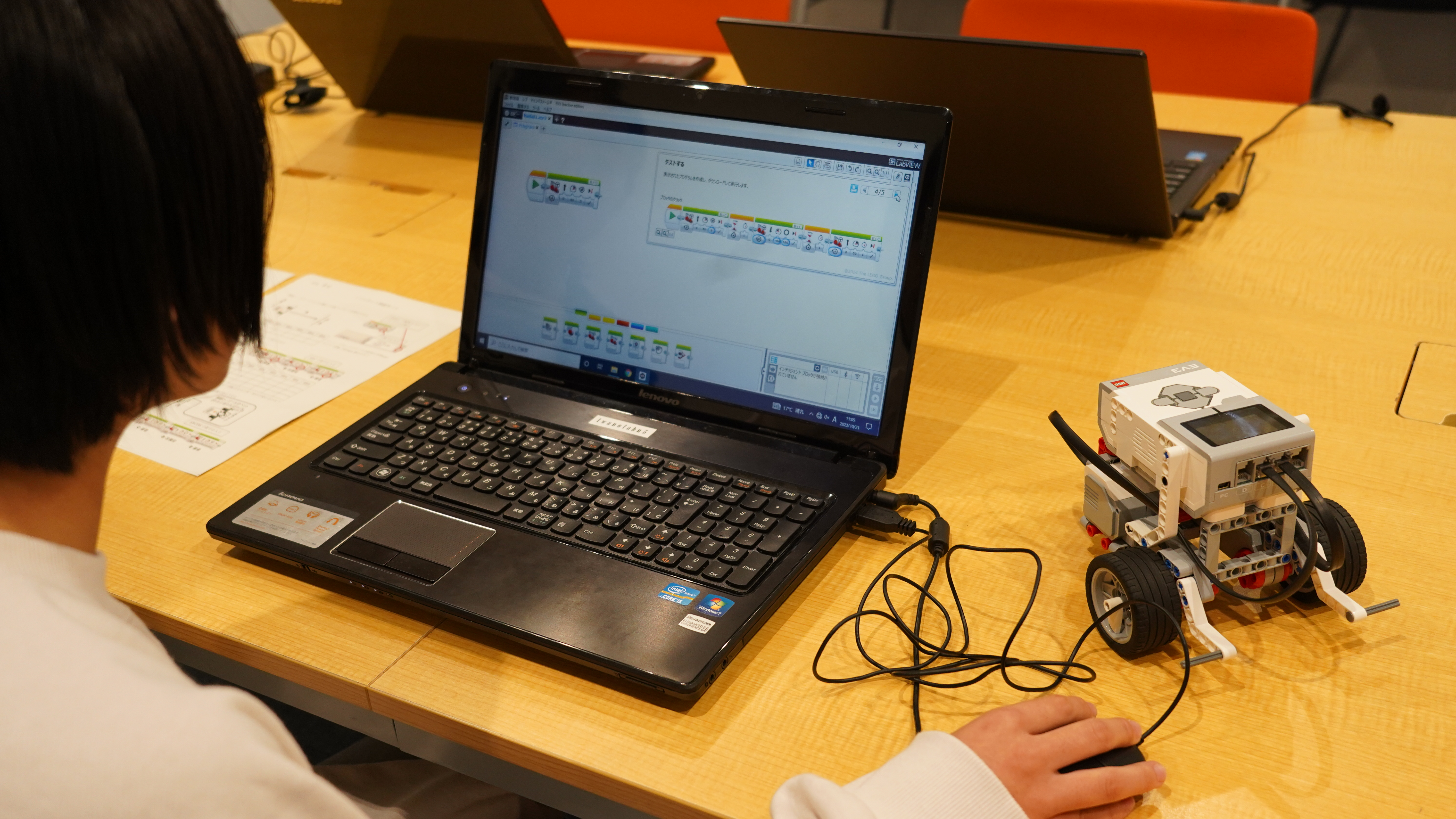 前半ではロボットの組み立てと制御にチャレンジしてもらいました。自分が命令した通りにロボットが動く喜びを感じてもらえたのではないかと思います。さらに、床とタイヤの滑りのために計算通りに動かない難しさも、工夫する楽しさとして感じてもらえたのではないかと思います。後半では、本校の授業や学校行事について紹介した後、座談会形式で様々な事柄を話し合いました。