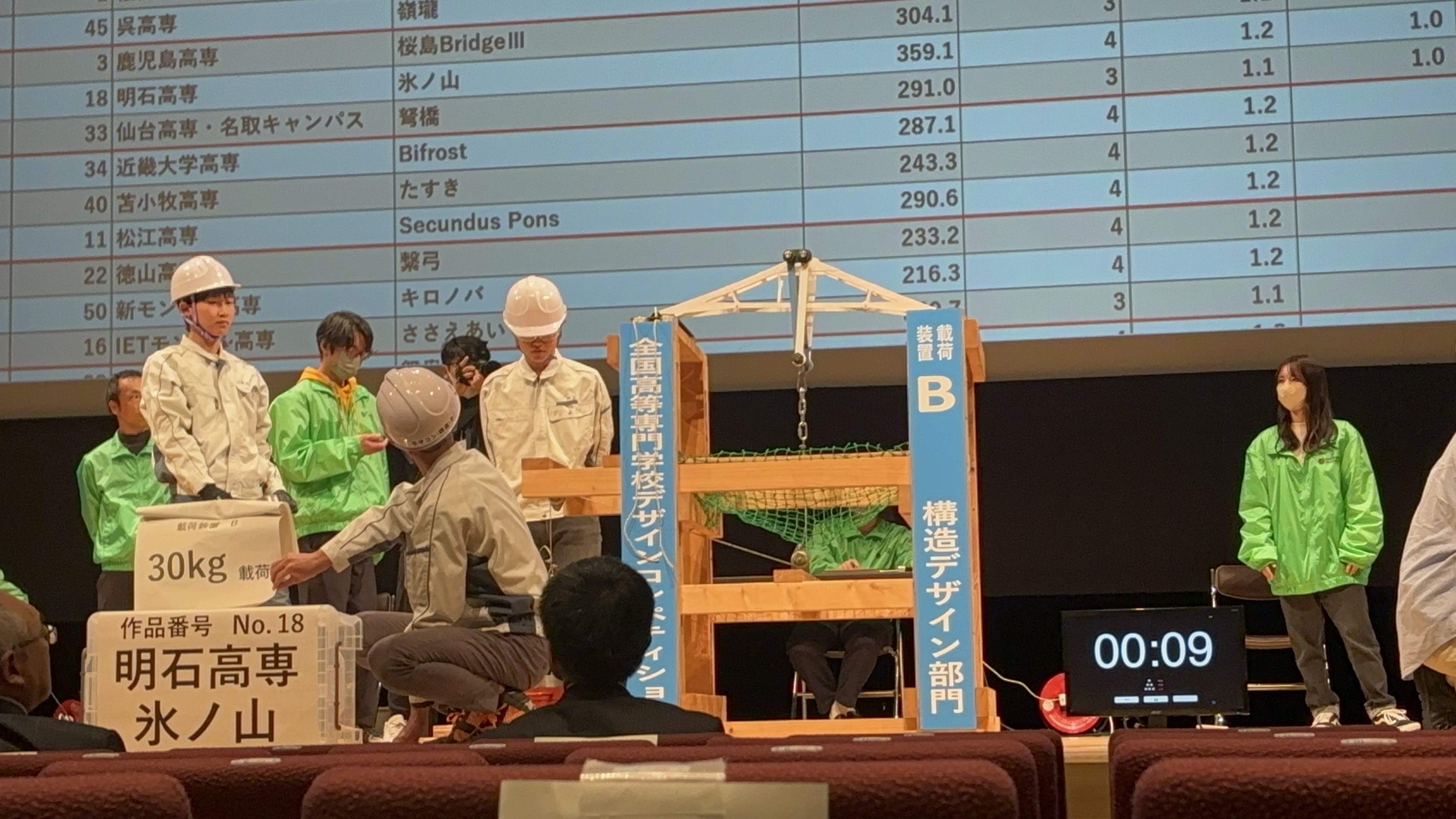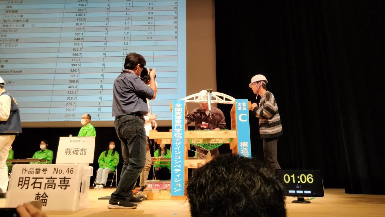 本校から出場した2チームは惜しくも40kgの載荷荷重まで耐えることが出来ず、全54チーム中15位(4年生チーム)、29位(3年生チーム)の結果となりました。