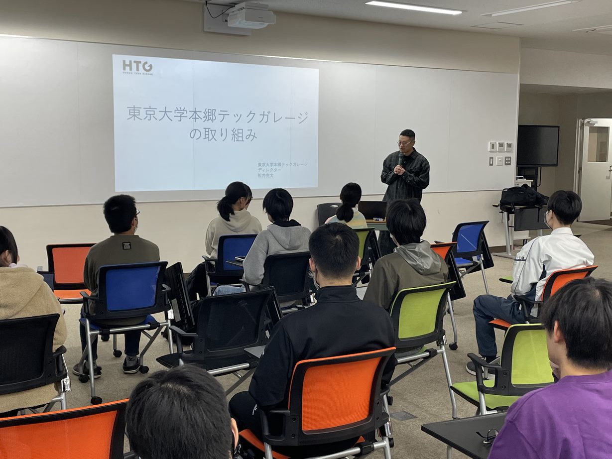 11月14日(火)、東京大学の松井克文先生を講師としてお迎えし、特別講演会「東大トーク」を開催しました。松井先生は、東大生が技術的なサイドプロジェクトを行うための秘密基地である「東京大学本郷テックガレージ(以下、テックガレージ)」のディレクターを務められています。