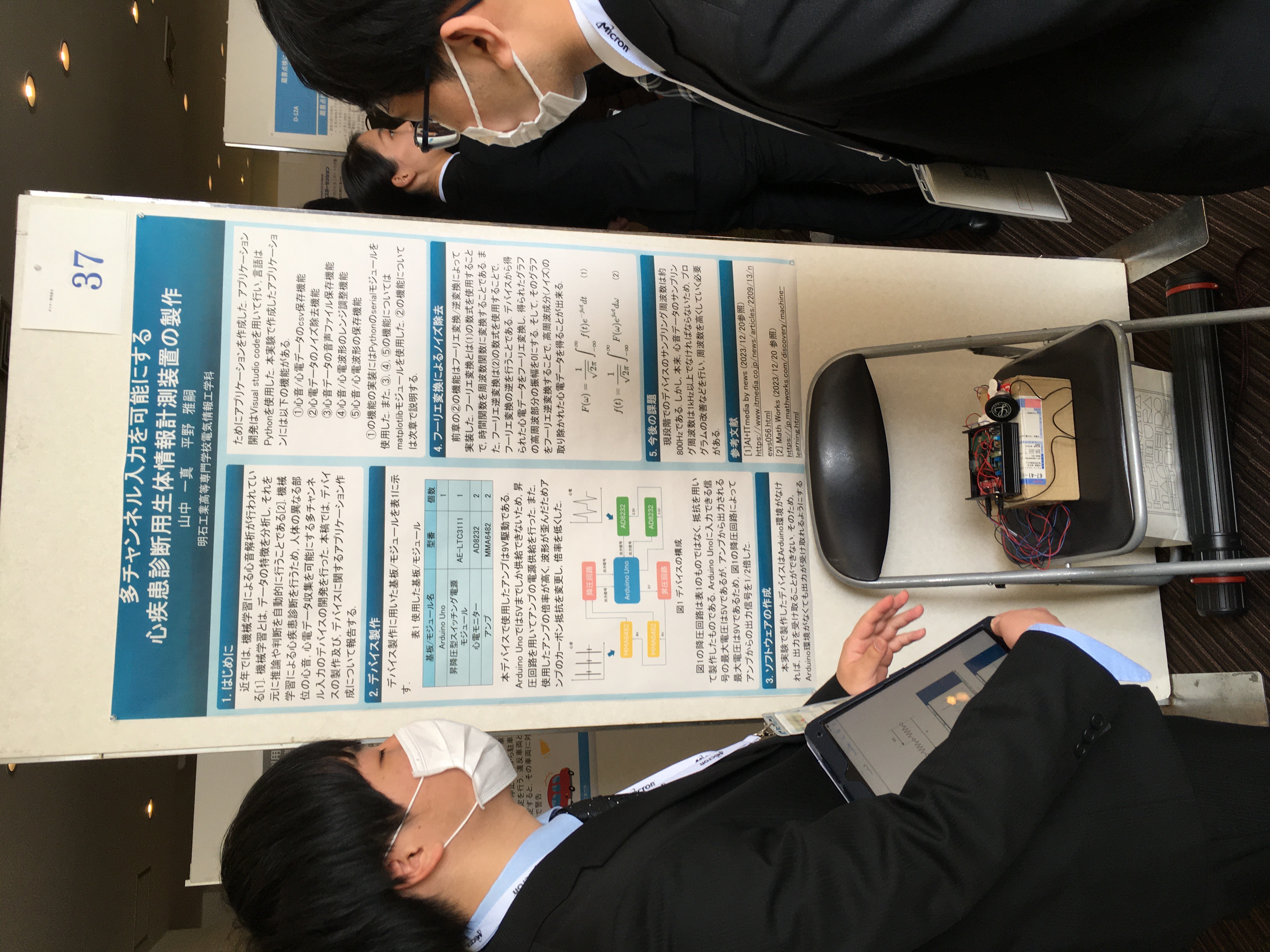 2024 年3月7 日(木)に開催された2024年電子情報通信学会総合大会特別企画「ジュニア&学生ポスターセッション」にて、本校 電気情報工学科3年(当時、現在4年)山中 一真さんが、「多チャンネル入力を可能にする心疾患診断用生体情報計測装置の製作」と題したポスター発表を行いました。