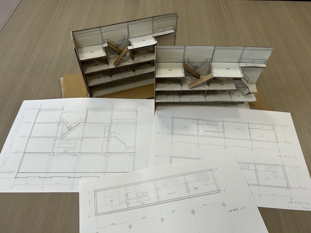 学生たちは見学の前に授業課題として平面図・断面図の作図および模型作成を行いました。