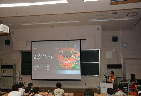 午後からは、RECHARGE株式会社様のスタッフより、LeMans24時間耐久レースを走った往年の名車「MAZDA767B」に関する当該レースの参加に至るまでの過程及び挑戦の様子や当該レースの挑戦後から本車両の復活に至るまでの過程が熱く語られた後、エンジンのチューニングについて、「MAZDA767B」の整備を例にしてご教示いただきました。