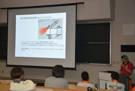本講演では、第一線で活躍されているエンジニアの方より車のエンジン及び車づくりの現状等について講演いただいた後、RECHARGE株式会社(兵庫県加古郡稲美町)の代表取締役である中村英孝氏より、夢や目標を達成するためには、どのような思考や下積み(勉強・経験等の自分磨きを含む)が必要となるかについて、ご自身の経験等も事例にして、熱意をもってご教示いただきました。