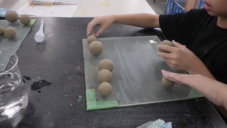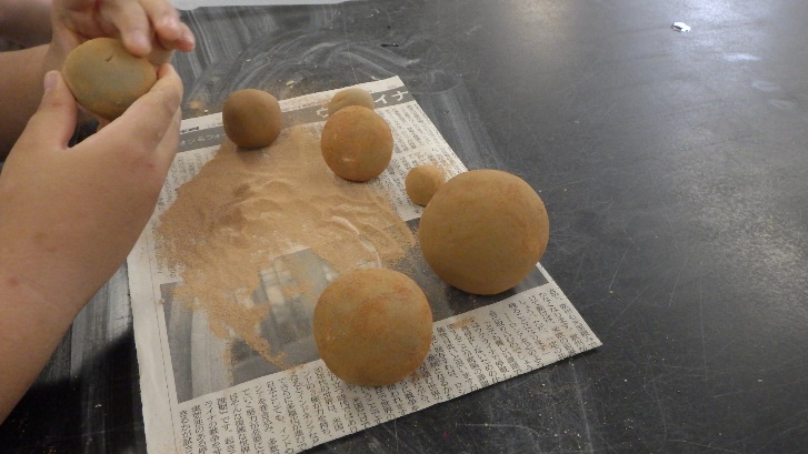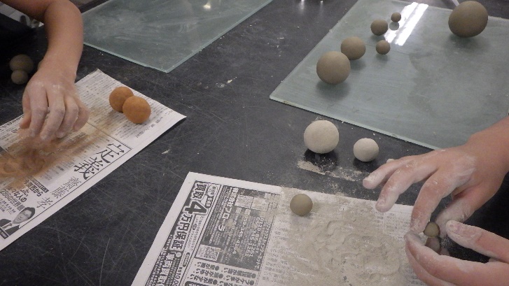 今年は昨年度の経験を生かして,メスシリンダーで水の量を測り,「笠岡粘土」に加えて泥団子に一番良い状態にしました。保護者にも泥団子づくりに参加してもらい,親子で同じ粘土を使って泥団子をつくる競争をしてもらいました。小学生だけでなく,保護者も大変楽しそうに泥団子をつくっていました。笠岡粘土だけでもきれいな泥団子をつくることができますが,小学生には様々な色の土を使ってカラフルな泥団子をつくってもらい,すごくきれいな泥団子ができあがりました。