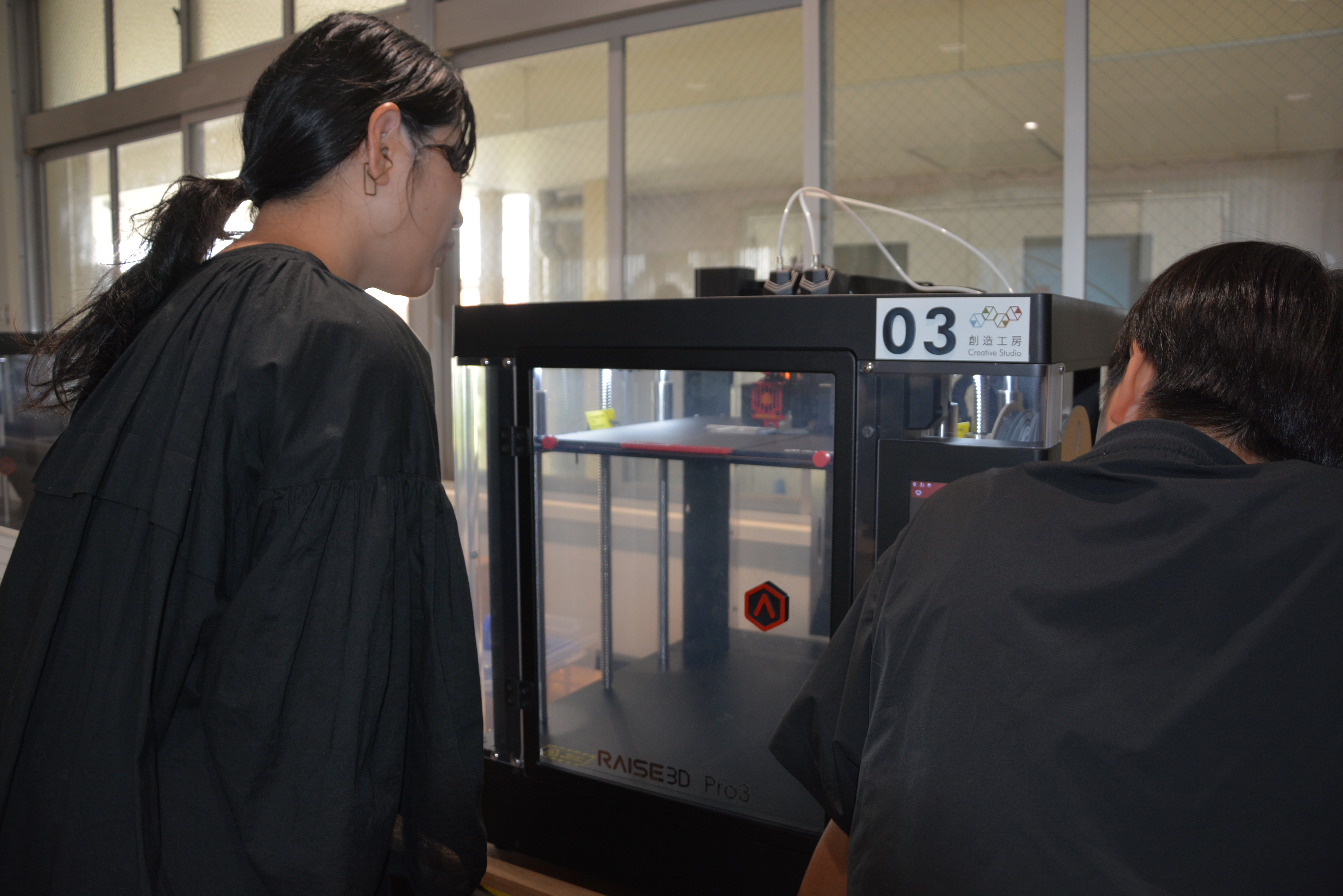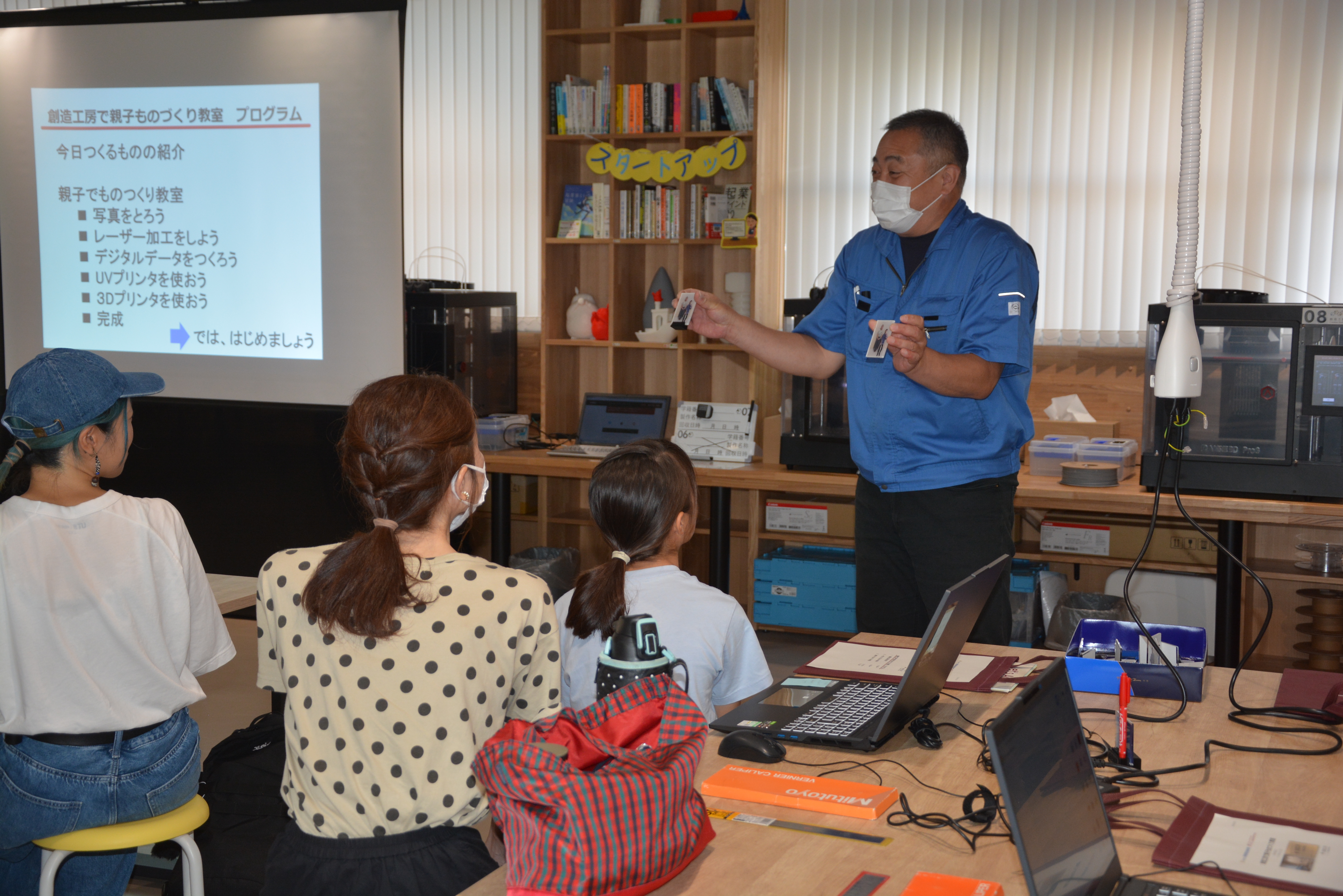 梶村教務主事や技術教育支援センター大西技術長から説明の後、創造工房にある3Dプリンタ等の機械を使い、親子で撮影した写真をアクリル板に印刷してプレートを作成し、そのプレートを差し込む台座の設計・作成づくりに挑戦しました。