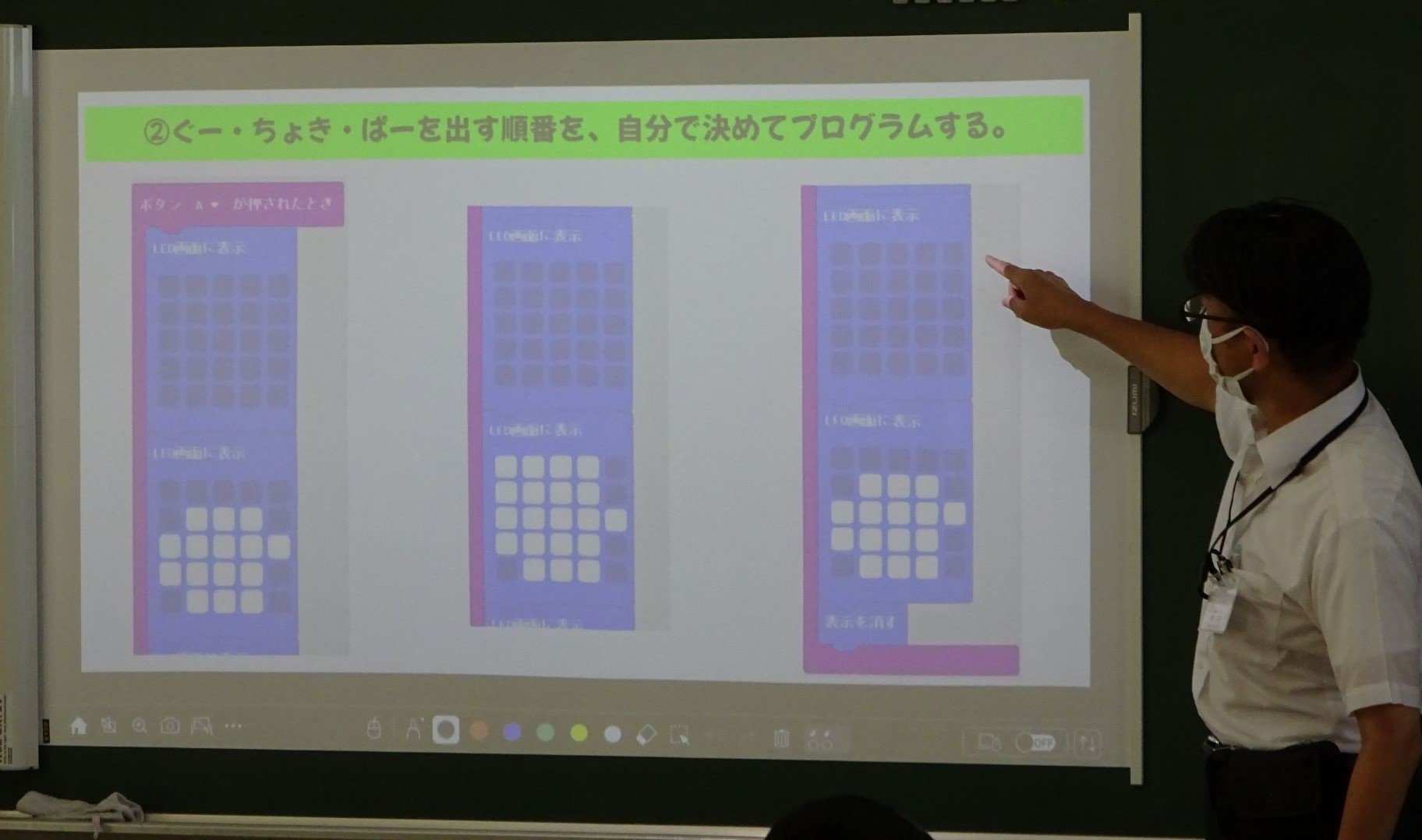 5年生は、Aボタンをおせば「グー」「チョキ」「パー」のどれかがランダムにでるプログラムを、6年生は、Aボタンをおせば「グー」、Bボタンをおせば「チョキ」、A+Bボタンをおせば「パー」が出るプログラムを作成しました。