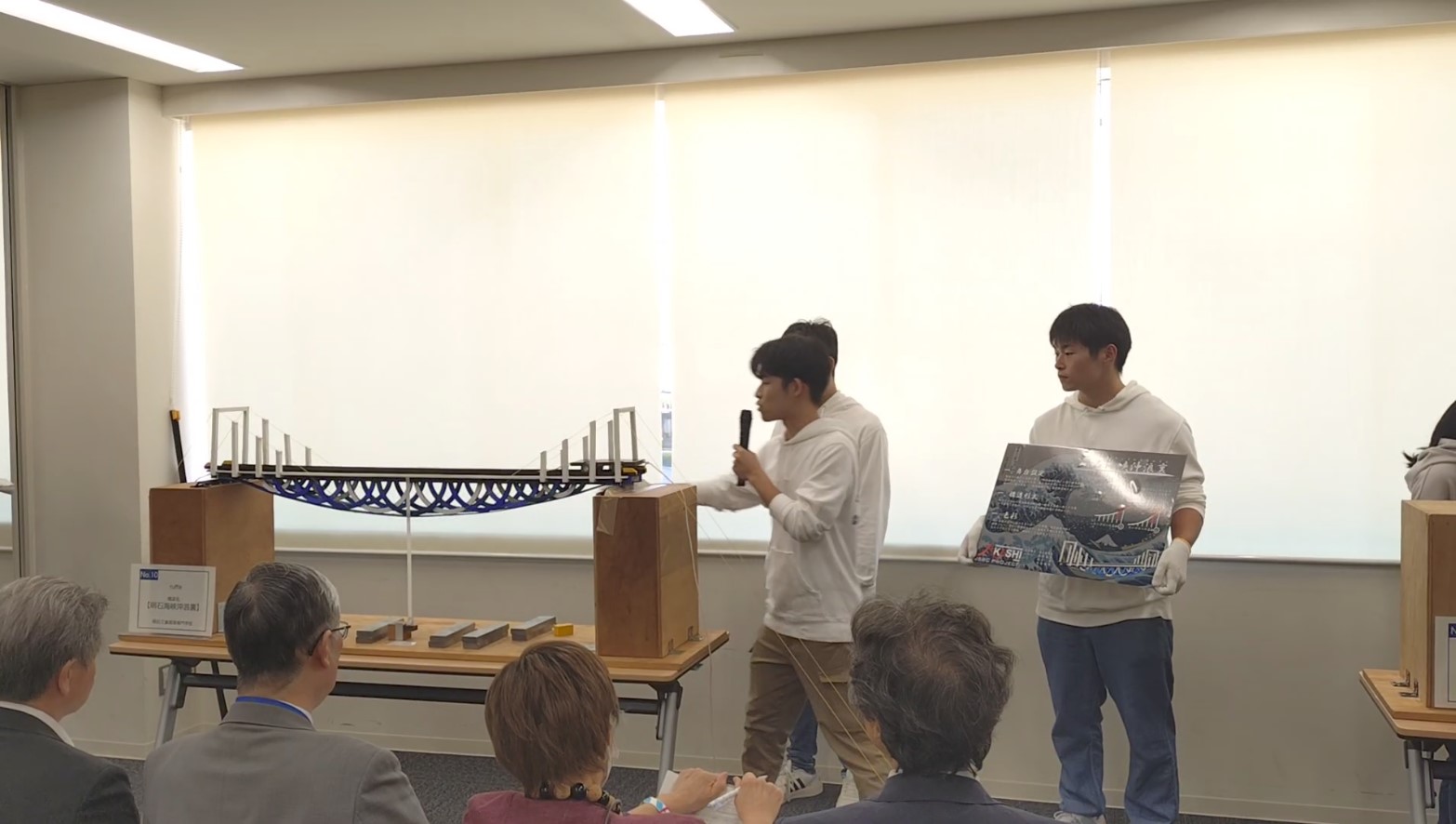 10月13日に開催された「土木の学校」、本州四国連絡高速道路株式会社主催の橋梁模型コンテストにおいて、都市システム工学科3年の衣笠真央さん、久保田千晴さん、島﨑晃太郎さん、末定遼之介さんが優秀賞、さらに都市システム工学科5年の藤原遥太さん、村上奨さん、渡邉由恭さんが技術賞を受賞しました。本コンテストは、橋長1400mm以上、重量1500g以内で橋梁模型を製作し、20kgの移動荷重で強度試験を行うという競技課題で、さらに模型の仕上がり具合、構造的合理性、デザイン等の審査基準をもとに、審査員によって審査されます。参加学生の模型は競技課題をクリアしただけでなく、構造的合理性やデザインを審査員から評価して頂き、本受賞となりました。