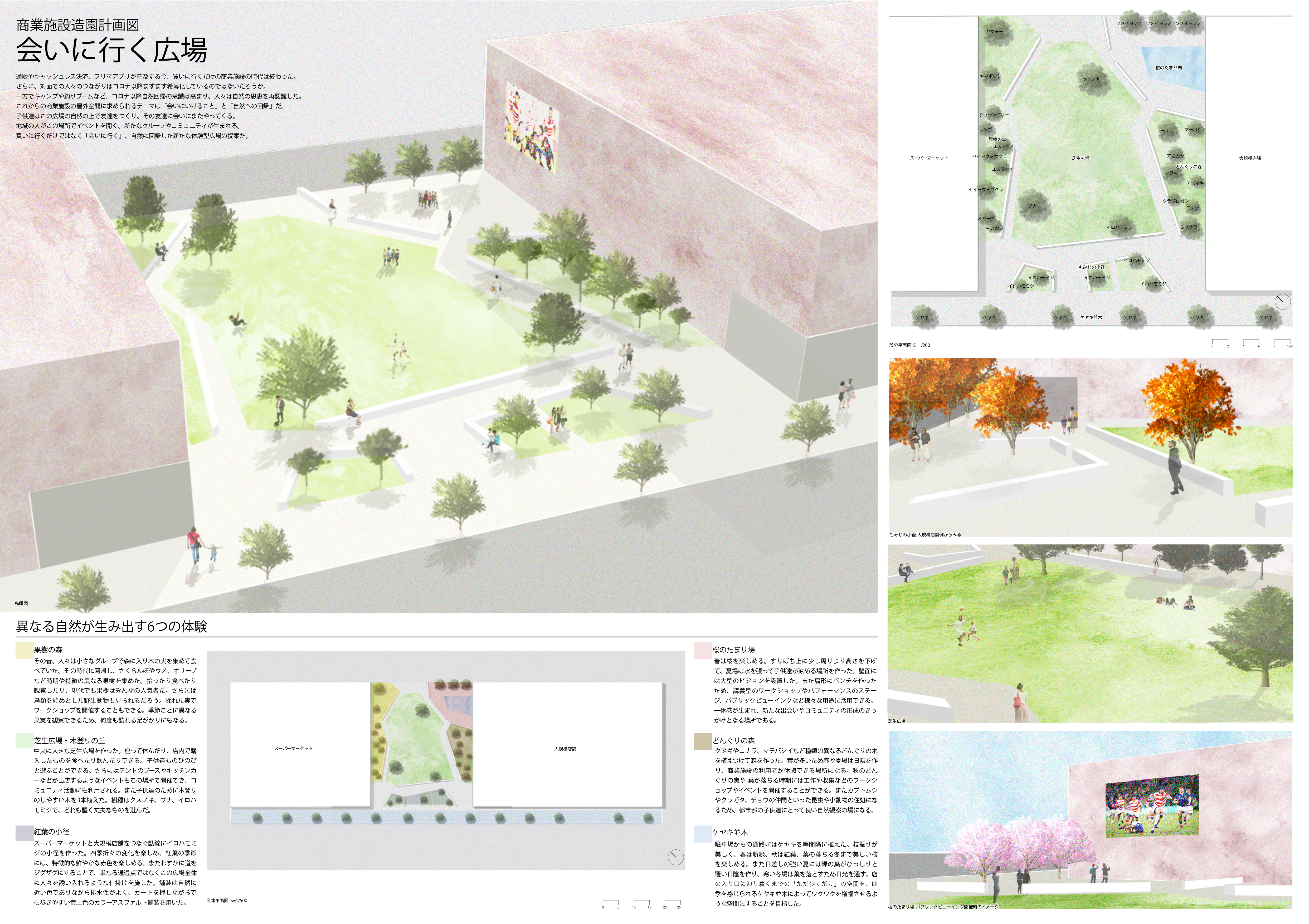 このコンペは一般・大学生・高校生の3部に分かれており、課題は「住宅庭園」「街区公園」「商業施設」「実習作品」の4部門と、高校1・2年生を対象とした「緑化フェア(みどりの広場)プラン」部門があります。